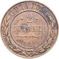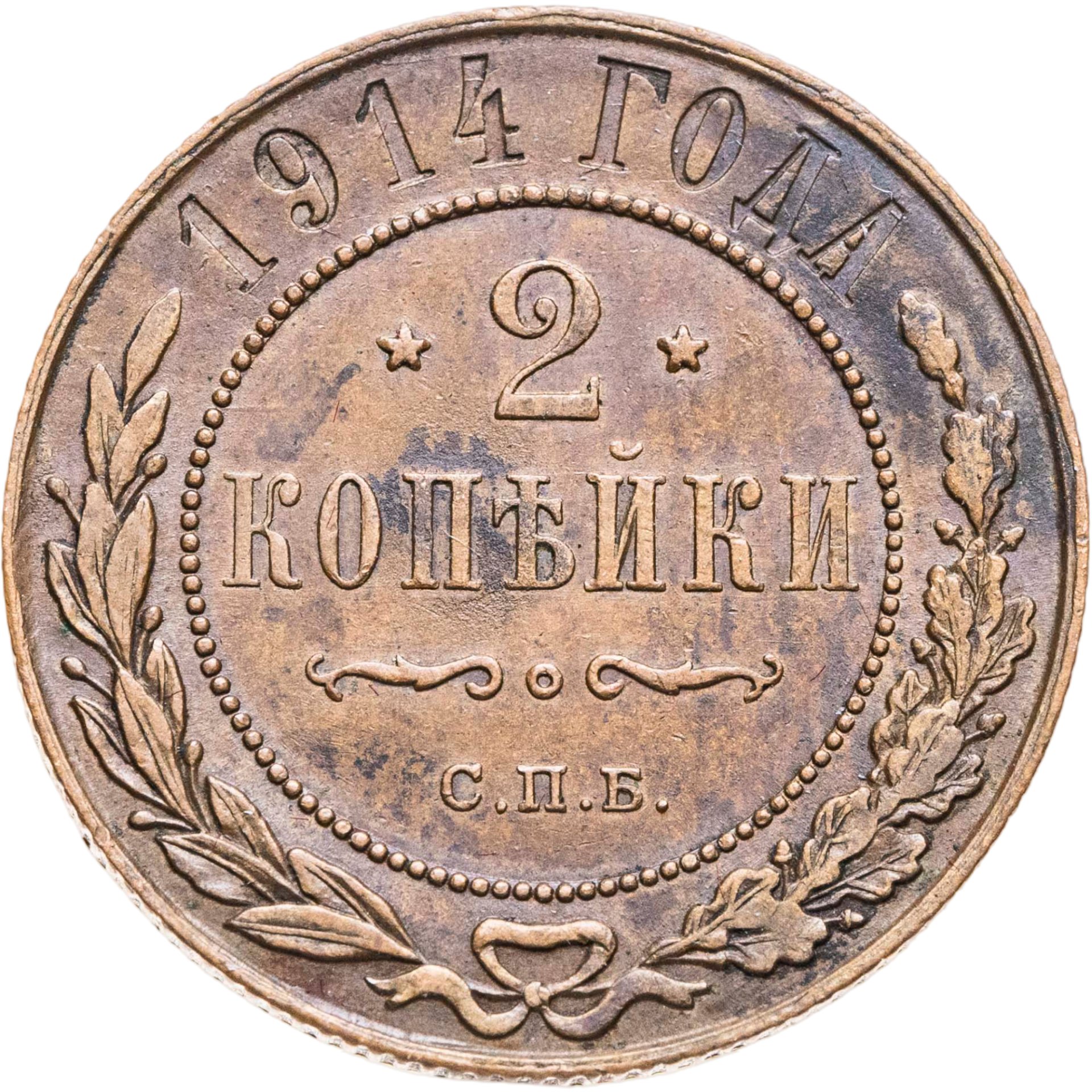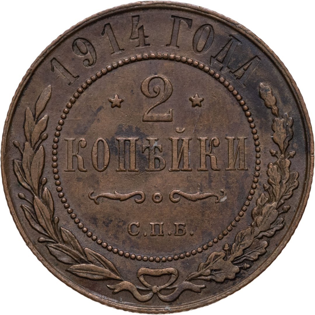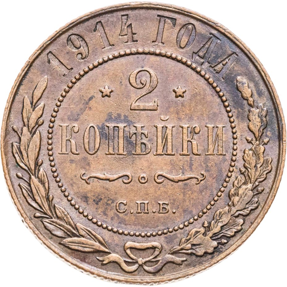 В центре указан номинал — цифра «2», ограниченная с обеих сторон звездочками. Под цифрой номинала — слово "КОПЕЙКИ". Ниже, расположен декоративный разделитель в виде двух изогнутых линий и небольшой окружности между ними. Под разделителем — обозначение монетного двора «С.П.Б.». Центральная часть отделена от остального изображения, окружностью в виде точек. В верхней части полукругом углубленная надпись: "1914 ГОДА". Ниже этой надписи, вдоль канта, изображен венок из лавровой и дубовой ветвей, которые, в нижней части, перевязаны лентой на узел бантом.