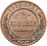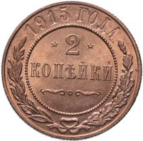 В центре указан номинал — цифра «2», ограниченная с обеих сторон звездочками. Под цифрой номинала — слово "КОПЕЙКИ". Ниже, расположен декоративный разделитель в виде двух изогнутых линий и небольшой окружности между ними. Центральная часть отделена от остального изображения, окружностью в виде точек. В верхней части полукругом углубленная надпись: "1915 ГОДА". Вдоль канта изображен венок из лавровой и дубовой ветвей, которые, в нижней части, перевязаны лентой на узел бантом.