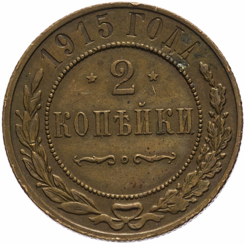 В центре указан номинал — цифра «2», ограниченная с обеих сторон звездочками. Под цифрой номинала — слово "КОПЕЙКИ". Ниже, расположен декоративный разделитель в виде двух изогнутых линий и небольшой окружности между ними. Центральная часть отделена от остального изображения, окружностью в виде точек. В верхней части полукругом углубленная надпись: "1915 ГОДА". Вдоль канта изображен венок из лавровой и дубовой ветвей, которые, в нижней части, перевязаны лентой на узел бантом.