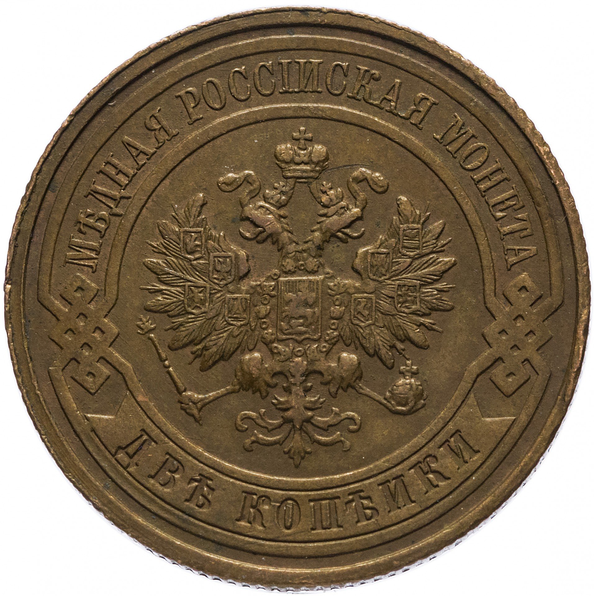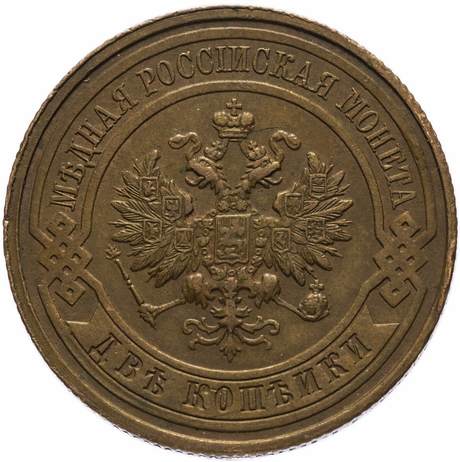В центре монеты изображен Малый Государственный Герб Российской империи - двуглавый орел, головы которого увенчаны двумя коронами, третья, большая корона над ними. Все они соединены лентой Андрея Первозванного. В правой лапе орла – скипетр, в левой – держава. На его груди расположен Московский герб, в щите изображен Георгий Победоносец с копьем поражающий дракона. Вокруг щита цепь ордена Св. Апостола Андрея Первозванного. На крыльях орла изображены гербы: Царства Казанского, Польского, Херсонеса Таврического, Астраханского, Сибирского, Грузинского и герб соединенных княжеств Киевского, Новгородского и Владимирского — по 4 на каждое крыло. По окружности - две полукруглые плашки, соединенные узорами. На верхней плашке выпуклая надпись: "МЕДНАЯ РОССИЙСКАЯ МОНЕТА". На нижней плашке, изображенной в виде ленты, углубленная надпись: "ДВЕ КОПЕЙКИ".