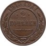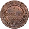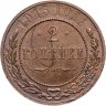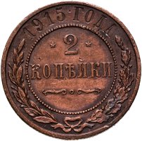 В центре указан номинал — цифра «2», ограниченная с обеих сторон звездочками. Под цифрой номинала — слово "КОПЕЙКИ". Ниже, расположен декоративный разделитель в виде двух изогнутых линий и небольшой окружности между ними. Центральная часть отделена от остального изображения, окружностью в виде точек. В верхней части полукругом углубленная надпись: "1915 ГОДА". Вдоль канта изображен венок из лавровой и дубовой ветвей, которые, в нижней части, перевязаны лентой на узел бантом.