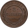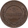 В центре монеты изображен Малый Государственный Герб Российской империи - двуглавый орел, головы которого увенчаны двумя коронами, третья, большая корона над ними. Все они соединены лентой Андрея Первозванного. В правой лапе орла – скипетр, в левой – держава. На его груди расположен Московский герб, в щите изображен Георгий Победоносец с копьем поражающий дракона. Вокруг щита цепь ордена Св. Апостола Андрея Первозванного. На крыльях орла изображены гербы: Царства Казанского, Польского, Херсонеса Таврического, Астраханского, Сибирского, Грузинского и герб соединенных княжеств Киевского, Новгородского и Владимирского — по 4 на каждое крыло. По окружности - две полукруглые плашки, соединенные узорами. На верхней плашке выпуклая надпись: "МЕДНАЯ РОССИЙСКАЯ МОНЕТА". На нижней плашке, изображенной в виде ленты, углубленная надпись: "ДВЕ КОПЕЙКИ".