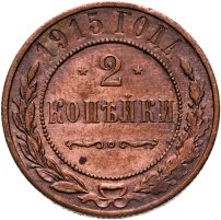 В центре указан номинал — цифра «2», ограниченная с обеих сторон звездочками. Под цифрой номинала — слово "КОПЕЙКИ". Ниже, расположен декоративный разделитель в виде двух изогнутых линий и небольшой окружности между ними. Центральная часть отделена от остального изображения, окружностью в виде точек. В верхней части полукругом углубленная надпись: "1915 ГОДА". Вдоль канта изображен венок из лавровой и дубовой ветвей, которые, в нижней части, перевязаны лентой на узел бантом.