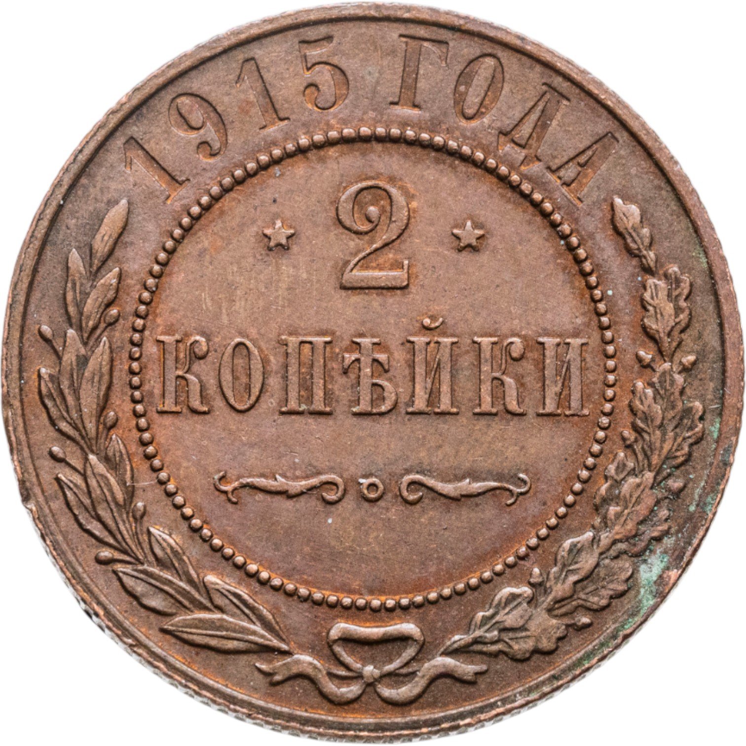 В центре указан номинал — цифра «2», ограниченная с обеих сторон звездочками. Под цифрой номинала — слово "КОПЕЙКИ". Ниже, расположен декоративный разделитель в виде двух изогнутых линий и небольшой окружности между ними. Центральная часть отделена от остального изображения, окружностью в виде точек. В верхней части полукругом углубленная надпись: "1915 ГОДА". Вдоль канта изображен венок из лавровой и дубовой ветвей, которые, в нижней части, перевязаны лентой на узел бантом.