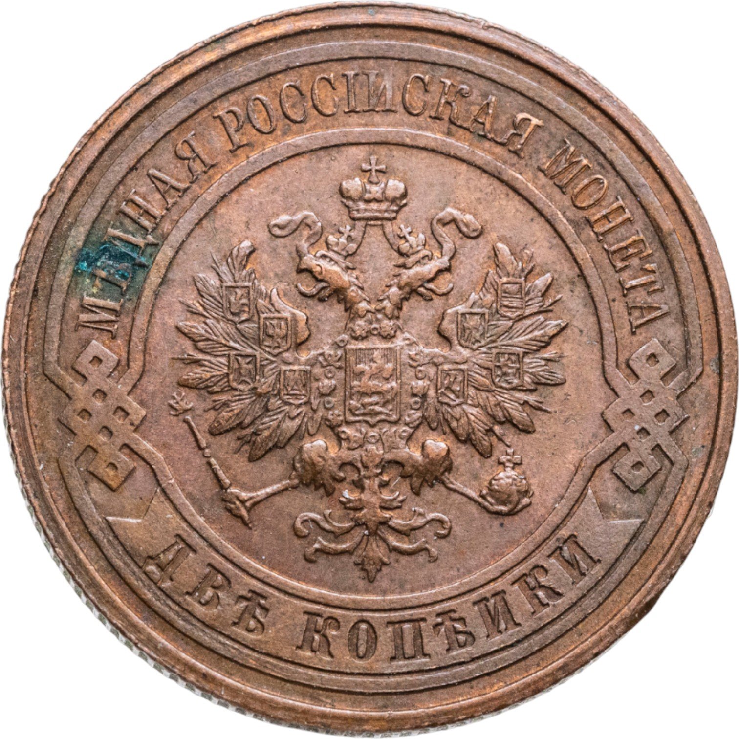 В центре монеты изображен Малый Государственный Герб Российской империи - двуглавый орел, головы которого увенчаны двумя коронами, третья, большая корона над ними. Все они соединены лентой Андрея Первозванного. В правой лапе орла – скипетр, в левой – держава. На его груди расположен Московский герб, в щите изображен Георгий Победоносец с копьем поражающий дракона. Вокруг щита цепь ордена Св. Апостола Андрея Первозванного. На крыльях орла изображены гербы: Царства Казанского, Польского, Херсонеса Таврического, Астраханского, Сибирского, Грузинского и герб соединенных княжеств Киевского, Новгородского и Владимирского — по 4 на каждое крыло. По окружности - две полукруглые плашки, соединенные узорами. На верхней плашке выпуклая надпись: "МЕДНАЯ РОССИЙСКАЯ МОНЕТА". На нижней плашке, изображенной в виде ленты, углубленная надпись: "ДВЕ КОПЕЙКИ".
