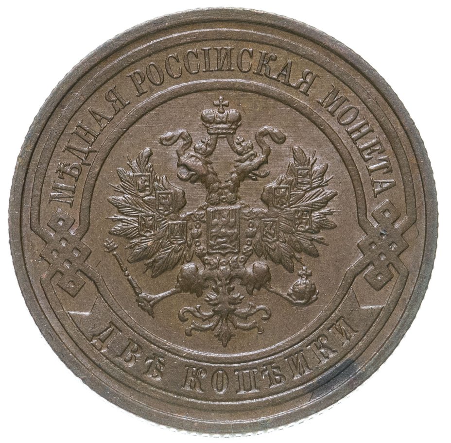 В центре монеты изображен Малый Государственный Герб Российской империи - двуглавый орел, головы которого увенчаны двумя коронами, третья, большая корона над ними. Все они соединены лентой Андрея Первозванного. В правой лапе орла – скипетр, в левой – держава. На его груди расположен Московский герб, в щите изображен Георгий Победоносец с копьем поражающий дракона. Вокруг щита цепь ордена Св. Апостола Андрея Первозванного. На крыльях орла изображены гербы: Царства Казанского, Польского, Херсонеса Таврического, Астраханского, Сибирского, Грузинского и герб соединенных княжеств Киевского, Новгородского и Владимирского — по 4 на каждое крыло. По окружности - две полукруглые плашки, соединенные узорами. На верхней плашке выпуклая надпись: "МЕДНАЯ РОССИЙСКАЯ МОНЕТА". На нижней плашке, изображенной в виде ленты, углубленная надпись: "ДВЕ КОПЕЙКИ".