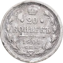 В центре указан номинал - цифра «20», ограниченная с обеих сторон звездочками. Над цифрой – Корона Российской империи. Под цифрой номинала — слово "КОПЕЕК". Ниже, расположен декоративный разделитель в виде двух разнонаправленных фигурных линий и стилизованным из точек крестом между ними. Под разделителем — дата выпуска монеты «1901». Под цифрой даты — обозначение монетного двора «С.П.Б.». Вдоль канта, не доходя до короны, изображен венок из лавровой и дубовой ветвей, которые, в нижней части, перевязаны лентой на узел бантом. По окружности канта имеются рельефные элементы, выполненные в виде зубцов.