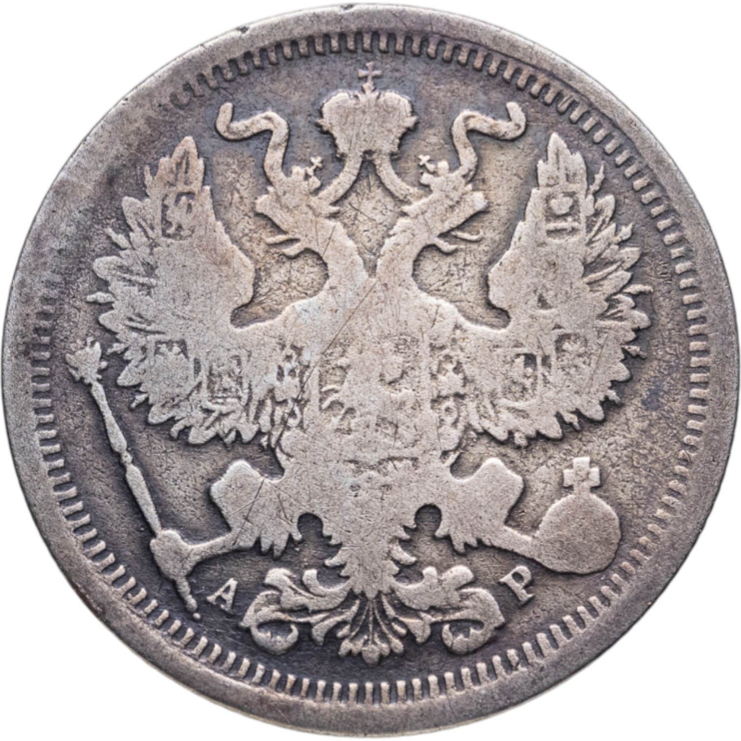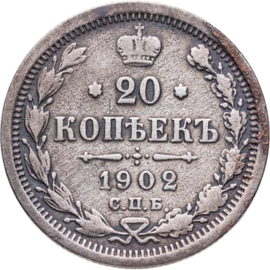 В центре указан номинал - цифра «20», ограниченная с обеих сторон звездочками. Над цифрой – Корона Российской империи. Под цифрой номинала — слово "КОПЕЕК". Ниже, расположен декоративный разделитель в виде двух разнонаправленных фигурных линий и стилизованным из точек крестом между ними. Под разделителем — дата выпуска монеты «1902». Под цифрой даты — обозначение монетного двора «С.П.Б.». Вдоль канта, не доходя до короны, изображен венок из лавровой и дубовой ветвей, которые, в нижней части, перевязаны лентой на узел бантом. По окружности канта имеются рельефные элементы, выполненные в виде зубцов.