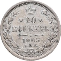В центре указан номинал - цифра «20», ограниченная с обеих сторон звездочками. Над цифрой – Корона Российской империи. Под цифрой номинала — слово "КОПЕЕК". Ниже, расположен декоративный разделитель в виде двух разнонаправленных фигурных линий и стилизованным из точек крестом между ними. Под разделителем — дата выпуска монеты «1903». Под цифрой даты — обозначение монетного двора «С.П.Б.». Вдоль канта, не доходя до короны, изображен венок из лавровой и дубовой ветвей, которые, в нижней части, перевязаны лентой на узел бантом. По окружности канта имеются рельефные элементы, выполненные в виде зубцов.
