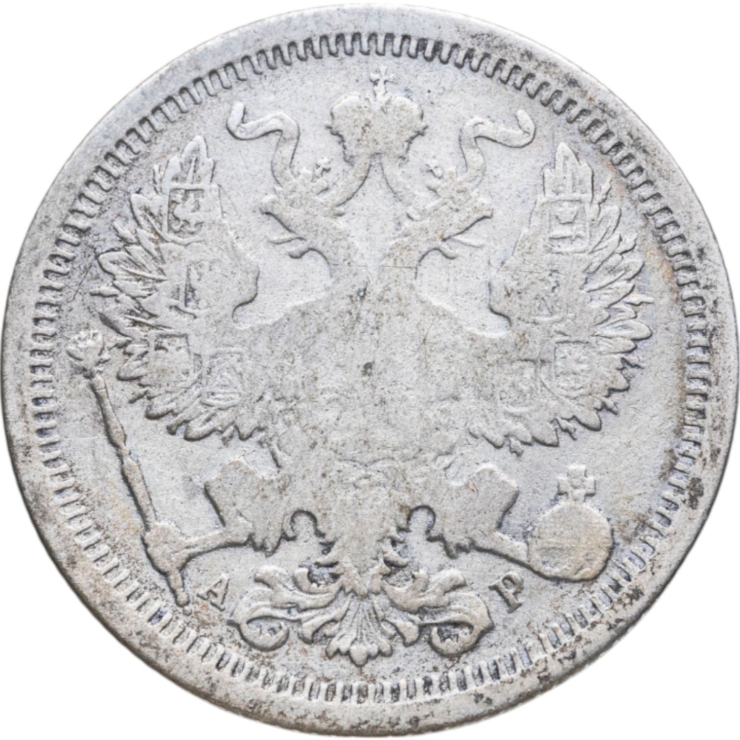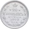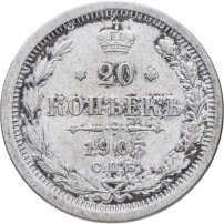 В центре указан номинал - цифра «20», ограниченная с обеих сторон звездочками. Над цифрой – Корона Российской империи. Под цифрой номинала — слово "КОПЕЕК". Ниже, расположен декоративный разделитель в виде двух разнонаправленных фигурных линий и стилизованным из точек крестом между ними. Под разделителем — дата выпуска монеты «1903». Под цифрой даты — обозначение монетного двора «С.П.Б.». Вдоль канта, не доходя до короны, изображен венок из лавровой и дубовой ветвей, которые, в нижней части, перевязаны лентой на узел бантом. По окружности канта имеются рельефные элементы, выполненные в виде зубцов.