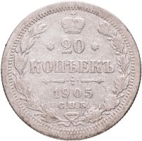 В центре указан номинал - цифра «20», ограниченная с обеих сторон звездочками. Над цифрой – Корона Российской империи. Под цифрой номинала — слово "КОПЕЕК". Ниже, расположен декоративный разделитель в виде двух разнонаправленных фигурных линий и стилизованным из точек крестом между ними. Под разделителем — дата выпуска монеты «1905». Под цифрой даты — обозначение монетного двора «С.П.Б.». Вдоль канта, не доходя до короны, изображен венок из лавровой и дубовой ветвей, которые, в нижней части, перевязаны лентой на узел бантом. По окружности канта имеются рельефные элементы, выполненные в виде зубцов.