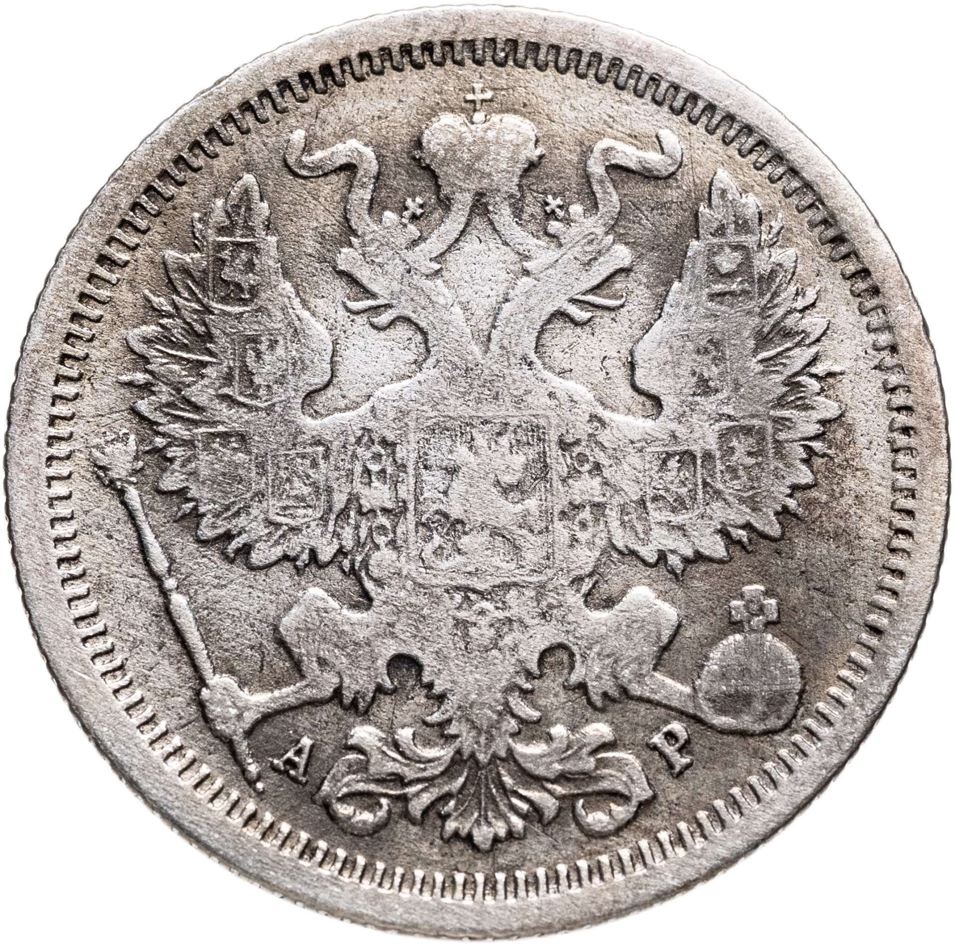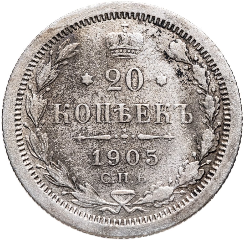 В центре указан номинал - цифра «20», ограниченная с обеих сторон звездочками. Над цифрой – Корона Российской империи. Под цифрой номинала — слово "КОПЕЕК". Ниже, расположен декоративный разделитель в виде двух разнонаправленных фигурных линий и стилизованным из точек крестом между ними. Под разделителем — дата выпуска монеты «1905». Под цифрой даты — обозначение монетного двора «С.П.Б.». Вдоль канта, не доходя до короны, изображен венок из лавровой и дубовой ветвей, которые, в нижней части, перевязаны лентой на узел бантом. По окружности канта имеются рельефные элементы, выполненные в виде зубцов.