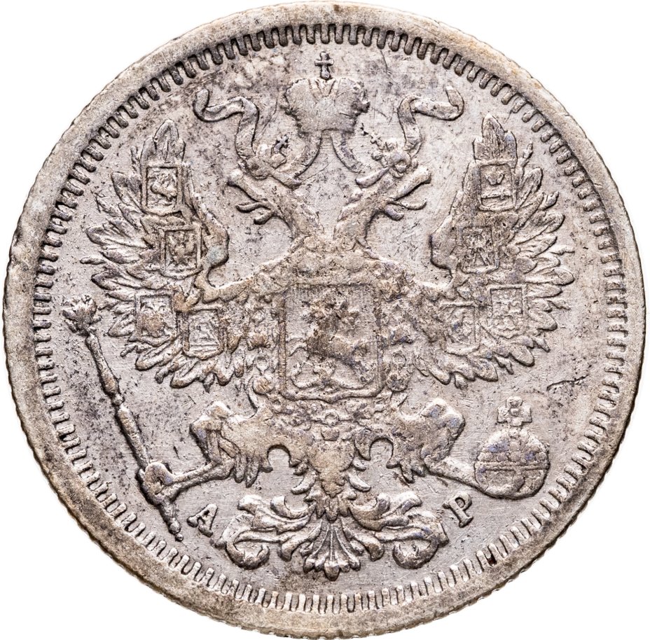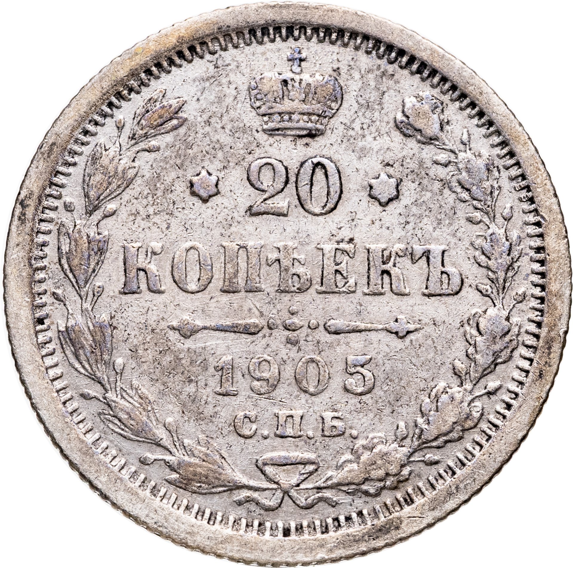 В центре указан номинал - цифра «20», ограниченная с обеих сторон звездочками. Над цифрой – Корона Российской империи. Под цифрой номинала — слово "КОПЕЕК". Ниже, расположен декоративный разделитель в виде двух разнонаправленных фигурных линий и стилизованным из точек крестом между ними. Под разделителем — дата выпуска монеты «1905». Под цифрой даты — обозначение монетного двора «С.П.Б.». Вдоль канта, не доходя до короны, изображен венок из лавровой и дубовой ветвей, которые, в нижней части, перевязаны лентой на узел бантом. По окружности канта имеются рельефные элементы, выполненные в виде зубцов.