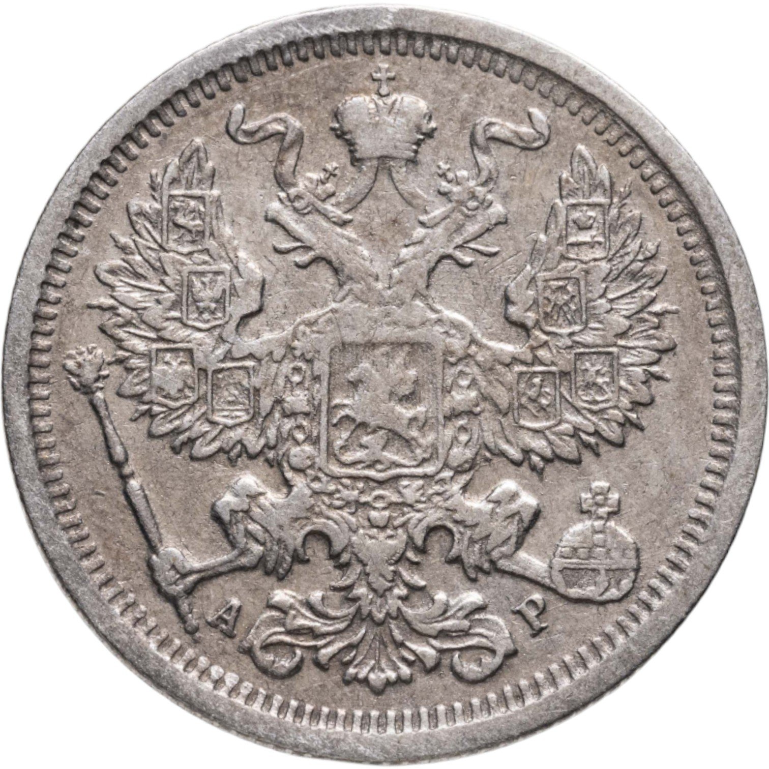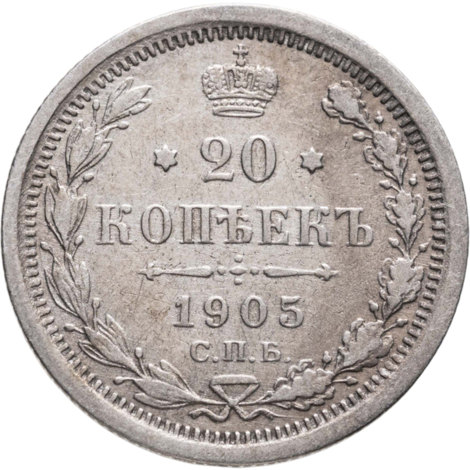 В центре указан номинал - цифра «20», ограниченная с обеих сторон звездочками. Над цифрой – Корона Российской империи. Под цифрой номинала — слово "КОПЕЕК". Ниже, расположен декоративный разделитель в виде двух разнонаправленных фигурных линий и стилизованным из точек крестом между ними. Под разделителем — дата выпуска монеты «1905». Под цифрой даты — обозначение монетного двора «С.П.Б.». Вдоль канта, не доходя до короны, изображен венок из лавровой и дубовой ветвей, которые, в нижней части, перевязаны лентой на узел бантом. По окружности канта имеются рельефные элементы, выполненные в виде зубцов.