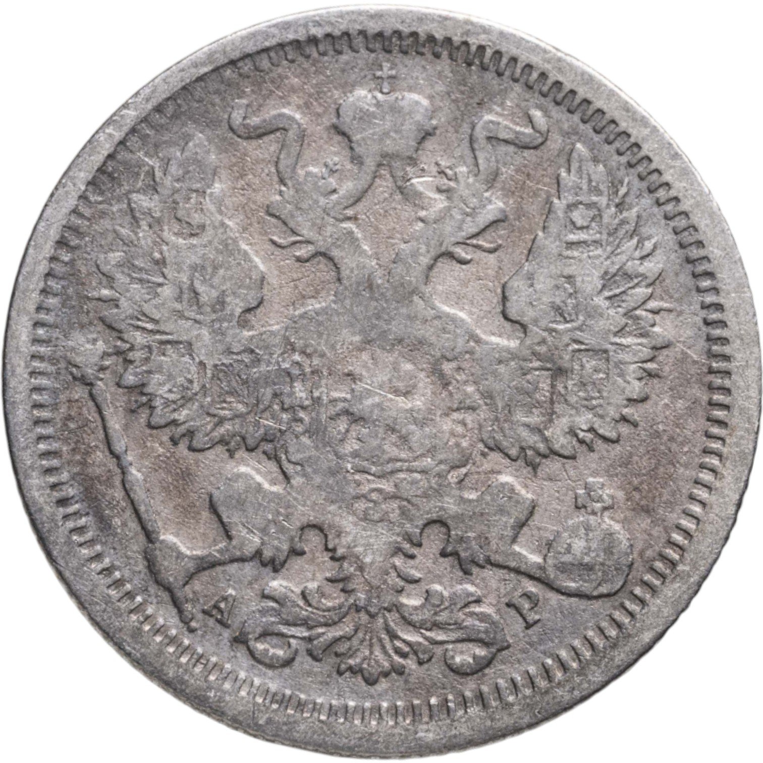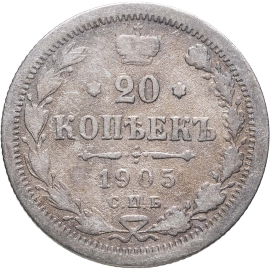 В центре указан номинал - цифра «20», ограниченная с обеих сторон звездочками. Над цифрой – Корона Российской империи. Под цифрой номинала — слово "КОПЕЕК". Ниже, расположен декоративный разделитель в виде двух разнонаправленных фигурных линий и стилизованным из точек крестом между ними. Под разделителем — дата выпуска монеты «1905». Под цифрой даты — обозначение монетного двора «С.П.Б.». Вдоль канта, не доходя до короны, изображен венок из лавровой и дубовой ветвей, которые, в нижней части, перевязаны лентой на узел бантом. По окружности канта имеются рельефные элементы, выполненные в виде зубцов.