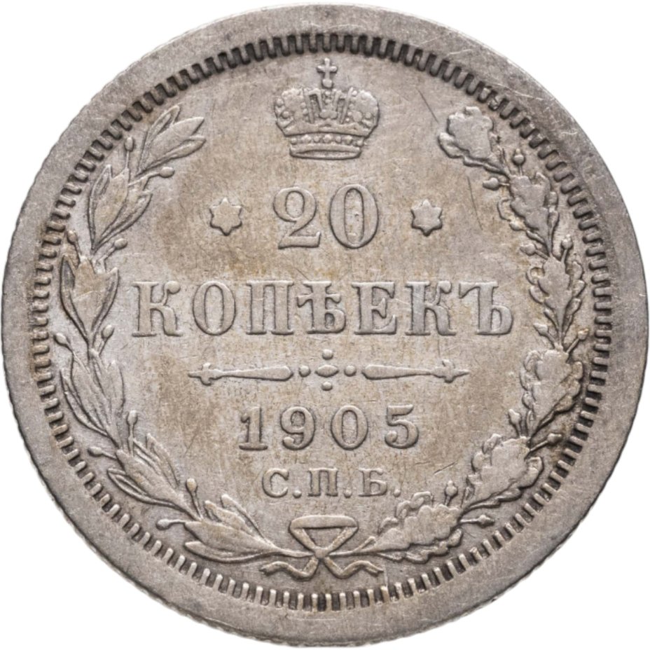 В центре указан номинал - цифра «20», ограниченная с обеих сторон звездочками. Над цифрой – Корона Российской империи. Под цифрой номинала — слово "КОПЕЕК". Ниже, расположен декоративный разделитель в виде двух разнонаправленных фигурных линий и стилизованным из точек крестом между ними. Под разделителем — дата выпуска монеты «1905». Под цифрой даты — обозначение монетного двора «С.П.Б.». Вдоль канта, не доходя до короны, изображен венок из лавровой и дубовой ветвей, которые, в нижней части, перевязаны лентой на узел бантом. По окружности канта имеются рельефные элементы, выполненные в виде зубцов.