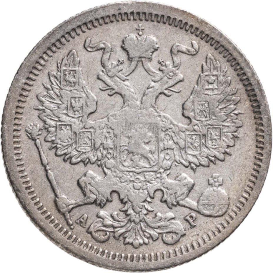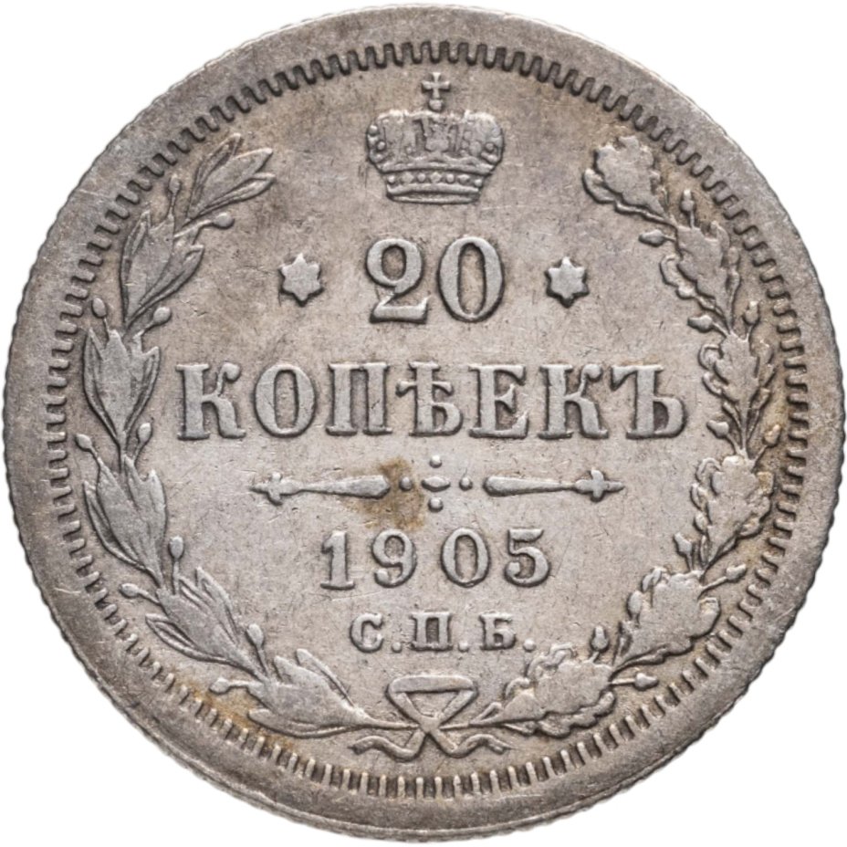 В центре указан номинал - цифра «20», ограниченная с обеих сторон звездочками. Над цифрой – Корона Российской империи. Под цифрой номинала — слово "КОПЕЕК". Ниже, расположен декоративный разделитель в виде двух разнонаправленных фигурных линий и стилизованным из точек крестом между ними. Под разделителем — дата выпуска монеты «1905». Под цифрой даты — обозначение монетного двора «С.П.Б.». Вдоль канта, не доходя до короны, изображен венок из лавровой и дубовой ветвей, которые, в нижней части, перевязаны лентой на узел бантом. По окружности канта имеются рельефные элементы, выполненные в виде зубцов.
