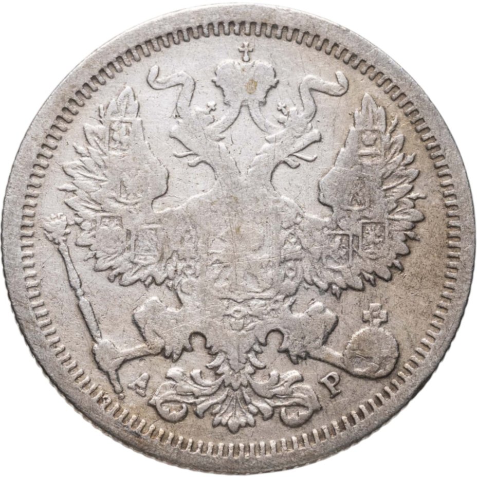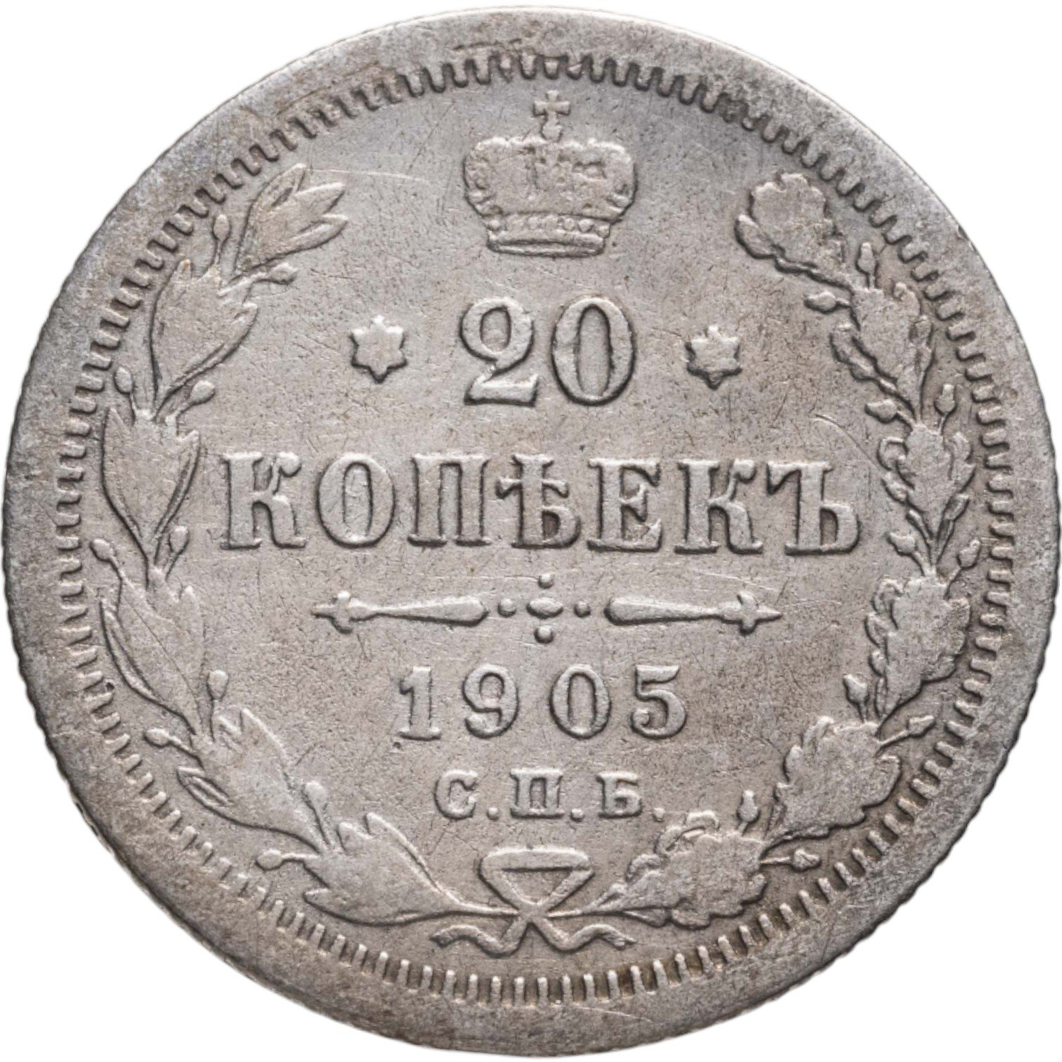 В центре указан номинал - цифра «20», ограниченная с обеих сторон звездочками. Над цифрой – Корона Российской империи. Под цифрой номинала — слово "КОПЕЕК". Ниже, расположен декоративный разделитель в виде двух разнонаправленных фигурных линий и стилизованным из точек крестом между ними. Под разделителем — дата выпуска монеты «1905». Под цифрой даты — обозначение монетного двора «С.П.Б.». Вдоль канта, не доходя до короны, изображен венок из лавровой и дубовой ветвей, которые, в нижней части, перевязаны лентой на узел бантом. По окружности канта имеются рельефные элементы, выполненные в виде зубцов.