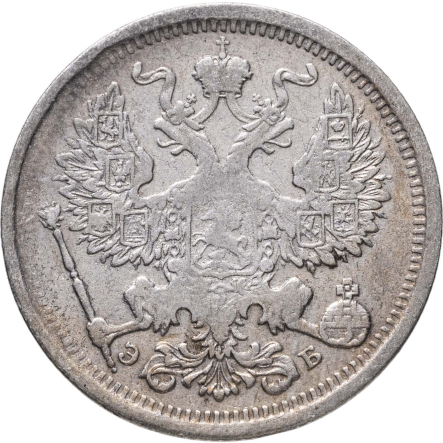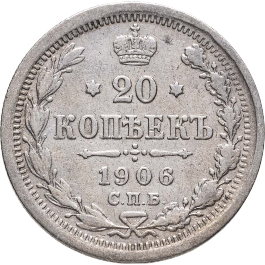 В центре указан номинал - цифра «20», ограниченная с обеих сторон звездочками. Над цифрой – Корона Российской империи. Под цифрой номинала — слово "КОПЕЕК". Ниже, расположен декоративный разделитель в виде двух разнонаправленных фигурных линий и стилизованным из точек крестом между ними. Под разделителем — дата выпуска монеты «1906». Под цифрой даты — обозначение монетного двора «С.П.Б.». Вдоль канта, не доходя до короны, изображен венок из лавровой и дубовой ветвей, которые, в нижней части, перевязаны лентой на узел бантом. По окружности канта имеются рельефные элементы, выполненные в виде зубцов.