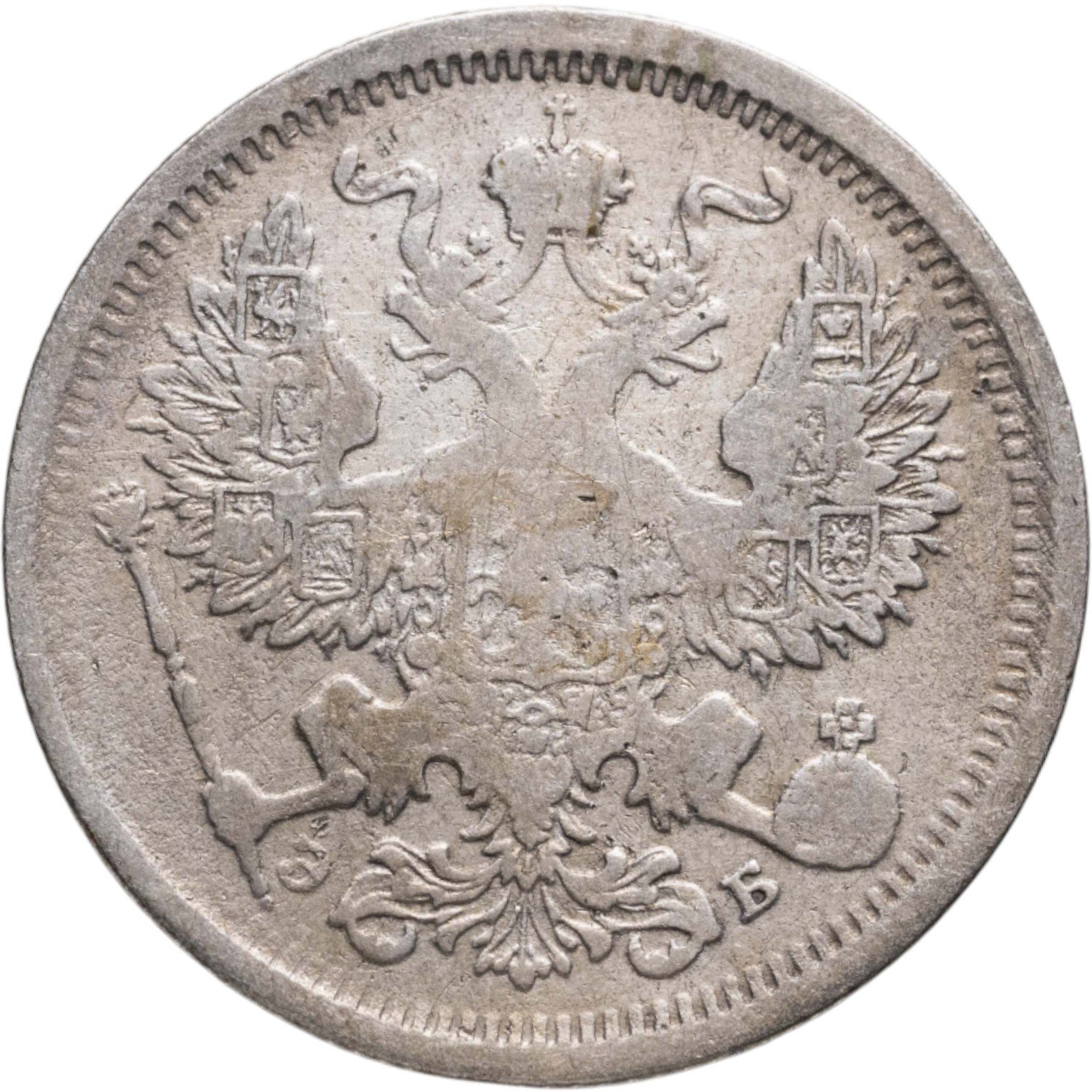 В центре указан номинал - цифра «20», ограниченная с обеих сторон звездочками. Над цифрой – Корона Российской империи. Под цифрой номинала — слово "КОПЕЕК". Ниже, расположен декоративный разделитель в виде двух разнонаправленных фигурных линий и стилизованным из точек крестом между ними. Под разделителем — дата выпуска монеты «1906». Под цифрой даты — обозначение монетного двора «С.П.Б.». Вдоль канта, не доходя до короны, изображен венок из лавровой и дубовой ветвей, которые, в нижней части, перевязаны лентой на узел бантом. По окружности канта имеются рельефные элементы, выполненные в виде зубцов.