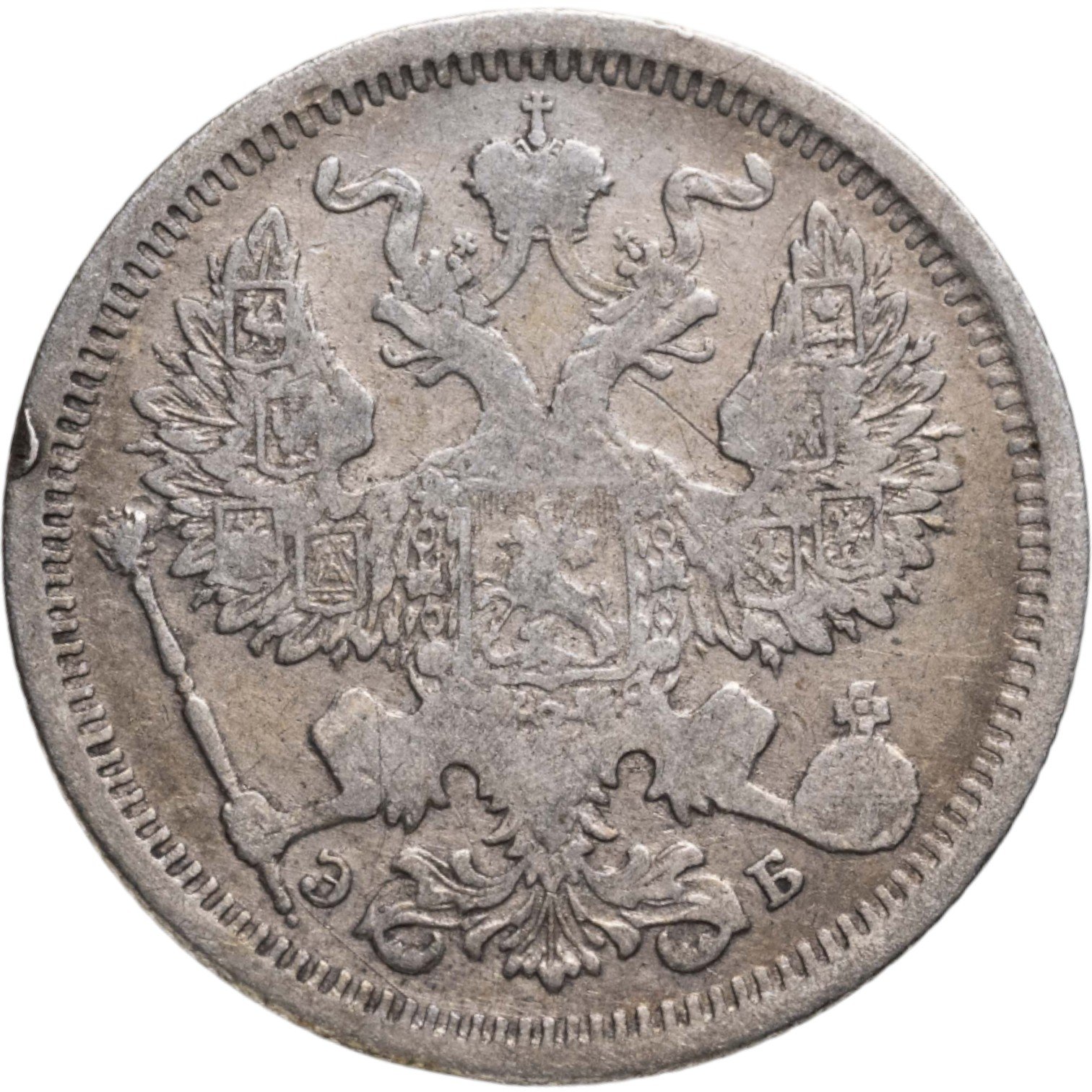 В центре указан номинал - цифра «20», ограниченная с обеих сторон звездочками. Над цифрой – Корона Российской империи. Под цифрой номинала — слово "КОПЕЕК". Ниже, расположен декоративный разделитель в виде двух разнонаправленных фигурных линий и стилизованным из точек крестом между ними. Под разделителем — дата выпуска монеты «1906». Под цифрой даты — обозначение монетного двора «С.П.Б.». Вдоль канта, не доходя до короны, изображен венок из лавровой и дубовой ветвей, которые, в нижней части, перевязаны лентой на узел бантом. По окружности канта имеются рельефные элементы, выполненные в виде зубцов.