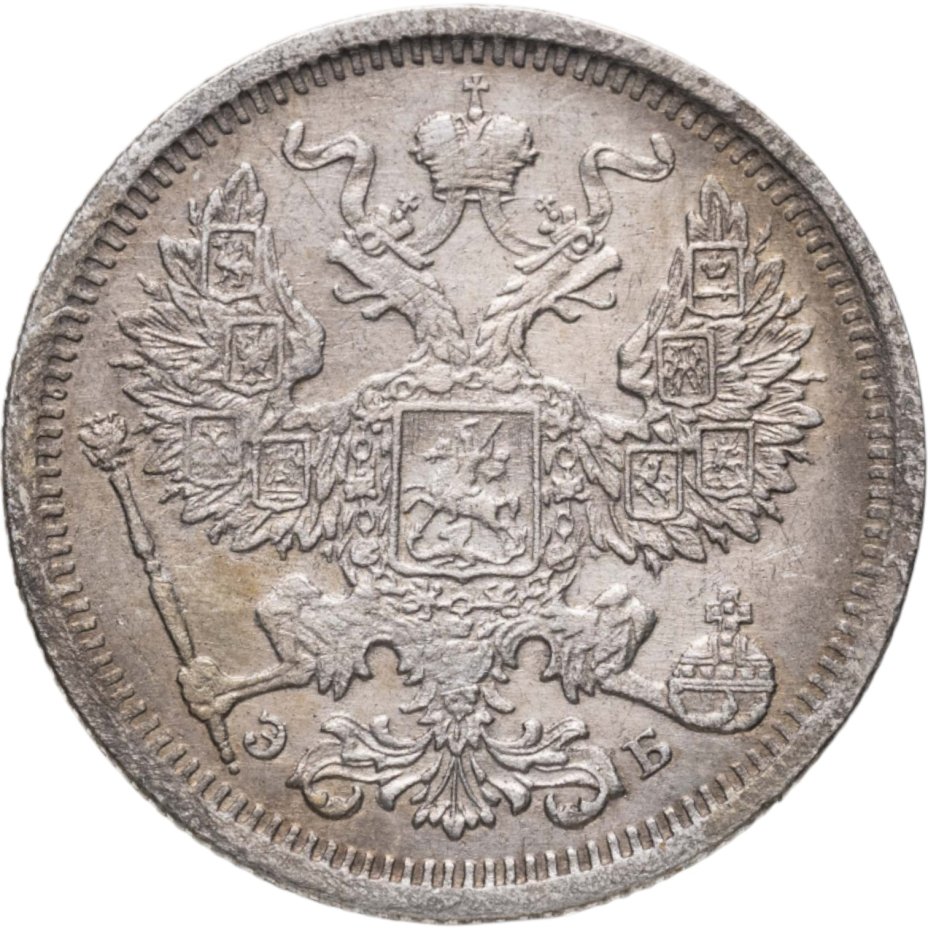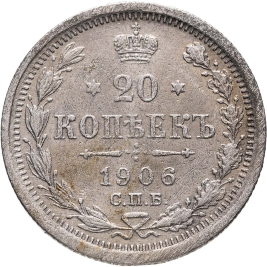 В центре указан номинал - цифра «20», ограниченная с обеих сторон звездочками. Над цифрой – Корона Российской империи. Под цифрой номинала — слово "КОПЕЕК". Ниже, расположен декоративный разделитель в виде двух разнонаправленных фигурных линий и стилизованным из точек крестом между ними. Под разделителем — дата выпуска монеты «1906». Под цифрой даты — обозначение монетного двора «С.П.Б.». Вдоль канта, не доходя до короны, изображен венок из лавровой и дубовой ветвей, которые, в нижней части, перевязаны лентой на узел бантом. По окружности канта имеются рельефные элементы, выполненные в виде зубцов.