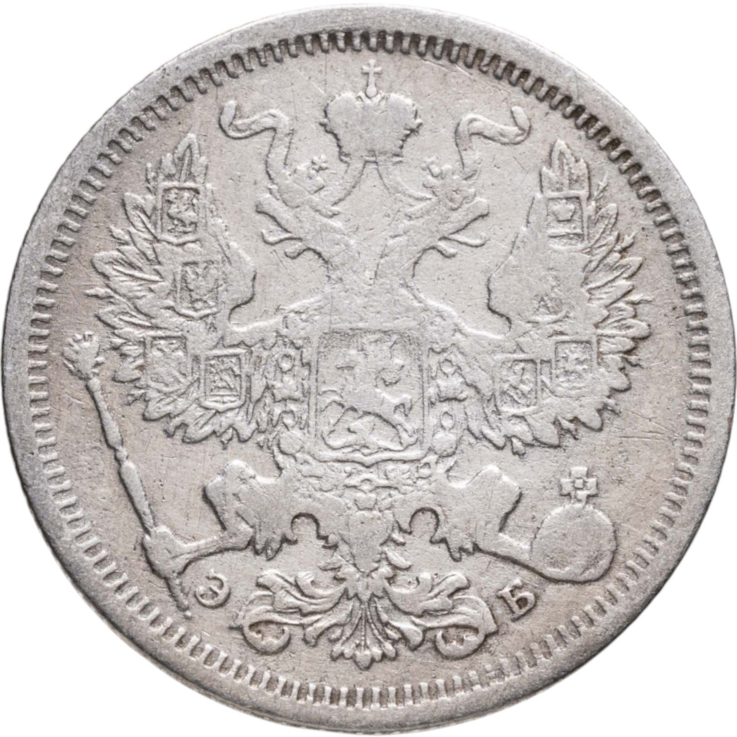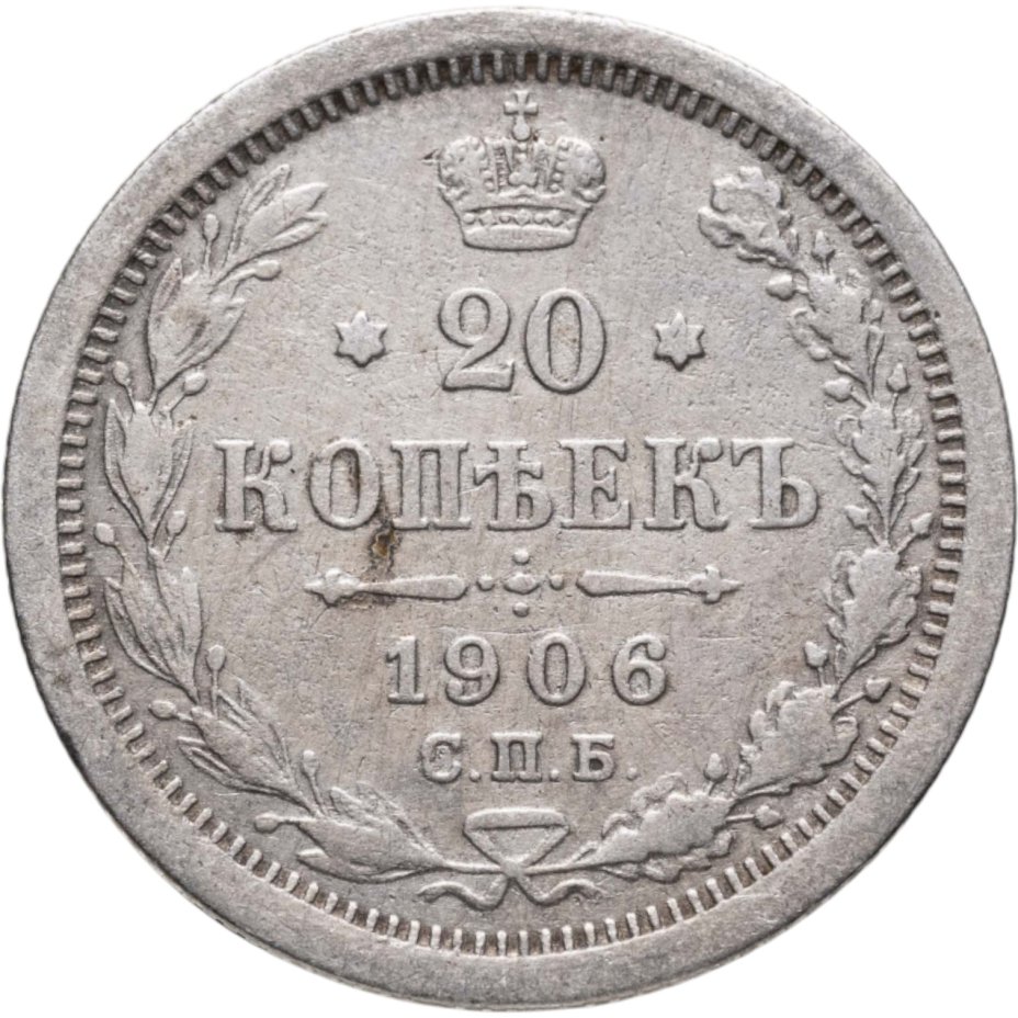 В центре указан номинал - цифра «20», ограниченная с обеих сторон звездочками. Над цифрой – Корона Российской империи. Под цифрой номинала — слово "КОПЕЕК". Ниже, расположен декоративный разделитель в виде двух разнонаправленных фигурных линий и стилизованным из точек крестом между ними. Под разделителем — дата выпуска монеты «1906». Под цифрой даты — обозначение монетного двора «С.П.Б.». Вдоль канта, не доходя до короны, изображен венок из лавровой и дубовой ветвей, которые, в нижней части, перевязаны лентой на узел бантом. По окружности канта имеются рельефные элементы, выполненные в виде зубцов.
