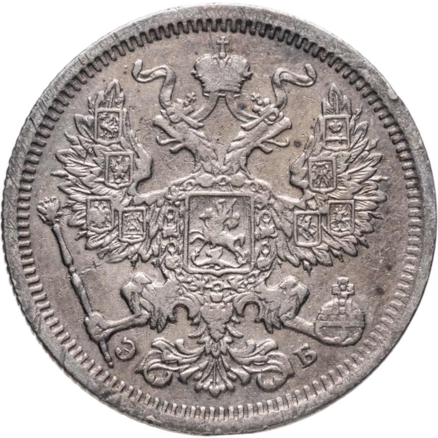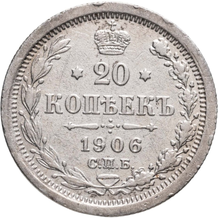 В центре указан номинал - цифра «20», ограниченная с обеих сторон звездочками. Над цифрой – Корона Российской империи. Под цифрой номинала — слово "КОПЕЕК". Ниже, расположен декоративный разделитель в виде двух разнонаправленных фигурных линий и стилизованным из точек крестом между ними. Под разделителем — дата выпуска монеты «1906». Под цифрой даты — обозначение монетного двора «С.П.Б.». Вдоль канта, не доходя до короны, изображен венок из лавровой и дубовой ветвей, которые, в нижней части, перевязаны лентой на узел бантом. По окружности канта имеются рельефные элементы, выполненные в виде зубцов.
