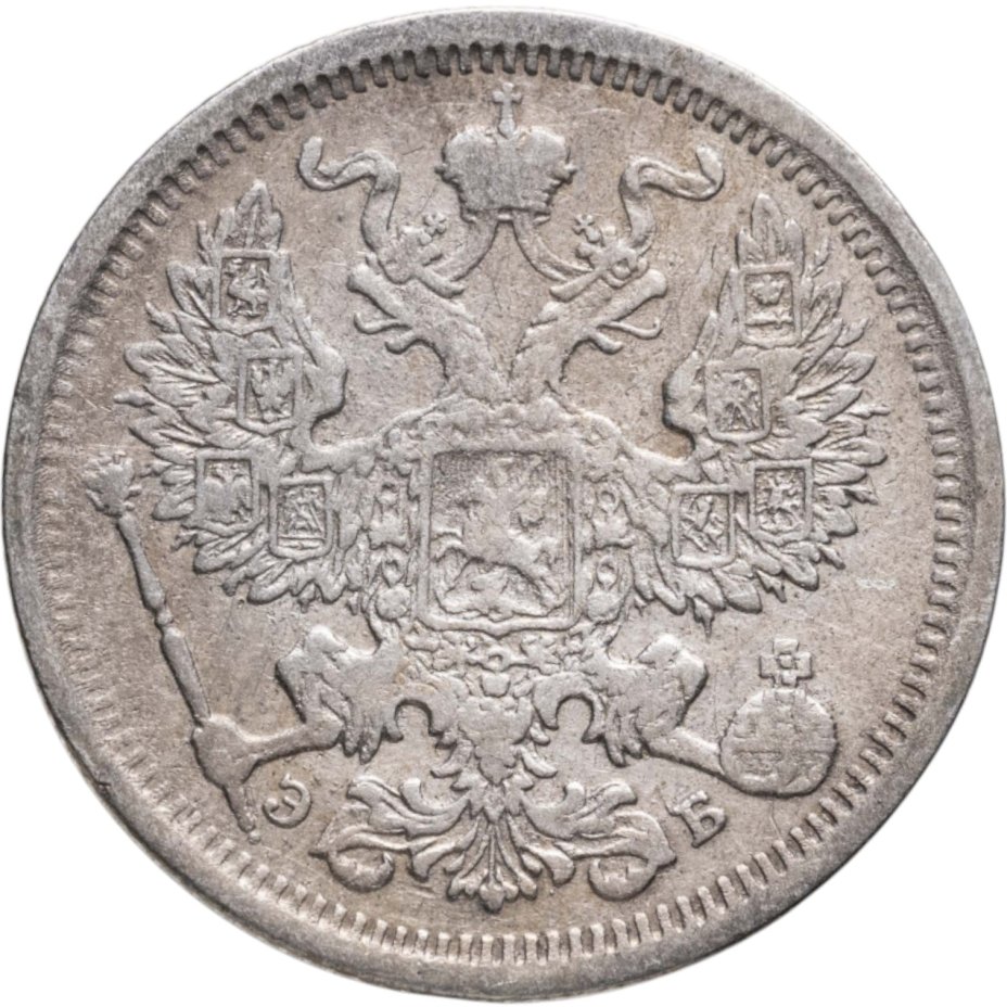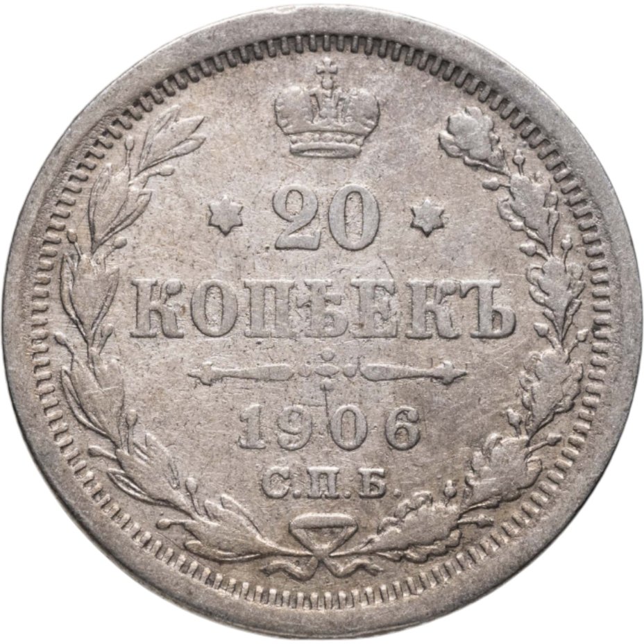 В центре указан номинал - цифра «20», ограниченная с обеих сторон звездочками. Над цифрой – Корона Российской империи. Под цифрой номинала — слово "КОПЕЕК". Ниже, расположен декоративный разделитель в виде двух разнонаправленных фигурных линий и стилизованным из точек крестом между ними. Под разделителем — дата выпуска монеты «1906». Под цифрой даты — обозначение монетного двора «С.П.Б.». Вдоль канта, не доходя до короны, изображен венок из лавровой и дубовой ветвей, которые, в нижней части, перевязаны лентой на узел бантом. По окружности канта имеются рельефные элементы, выполненные в виде зубцов.