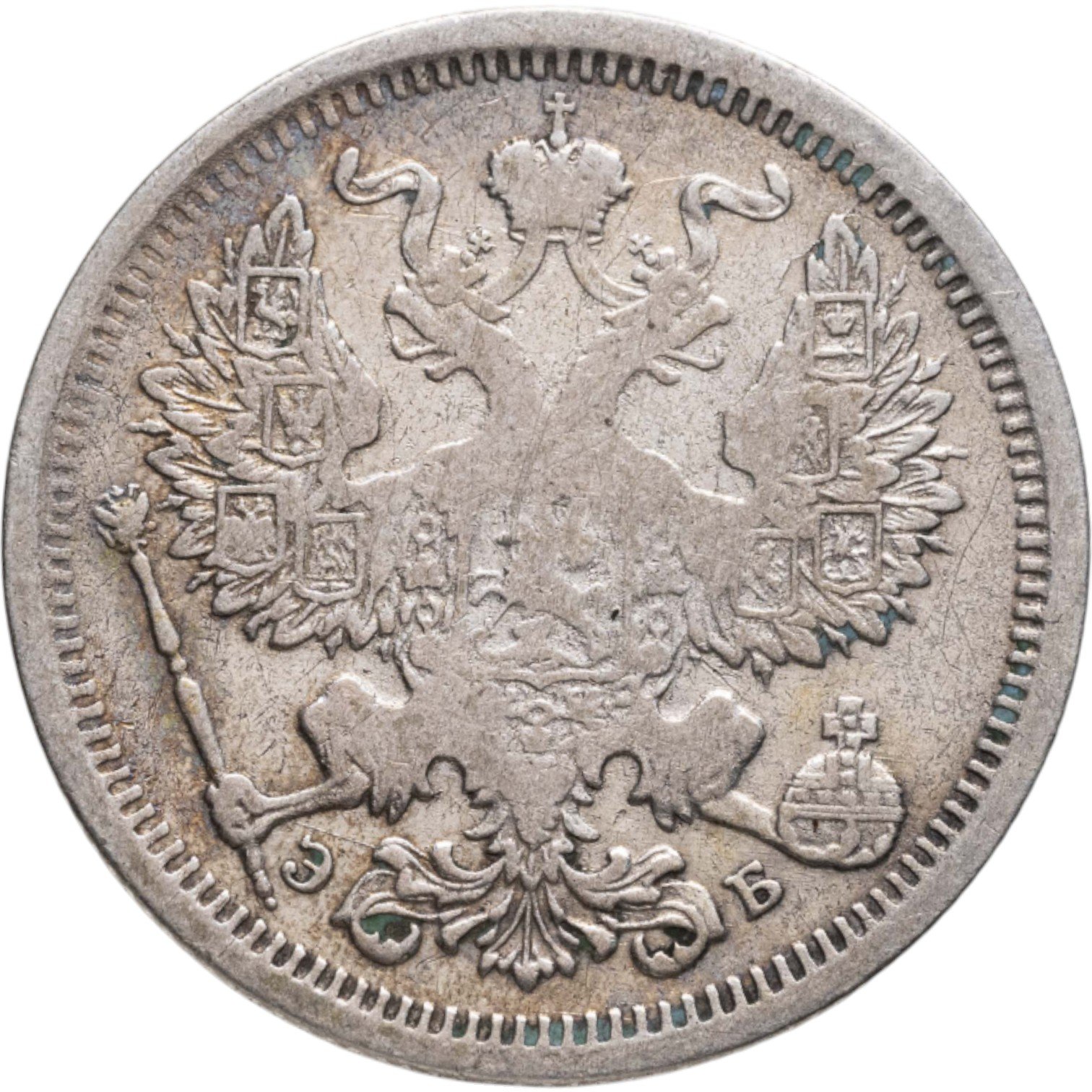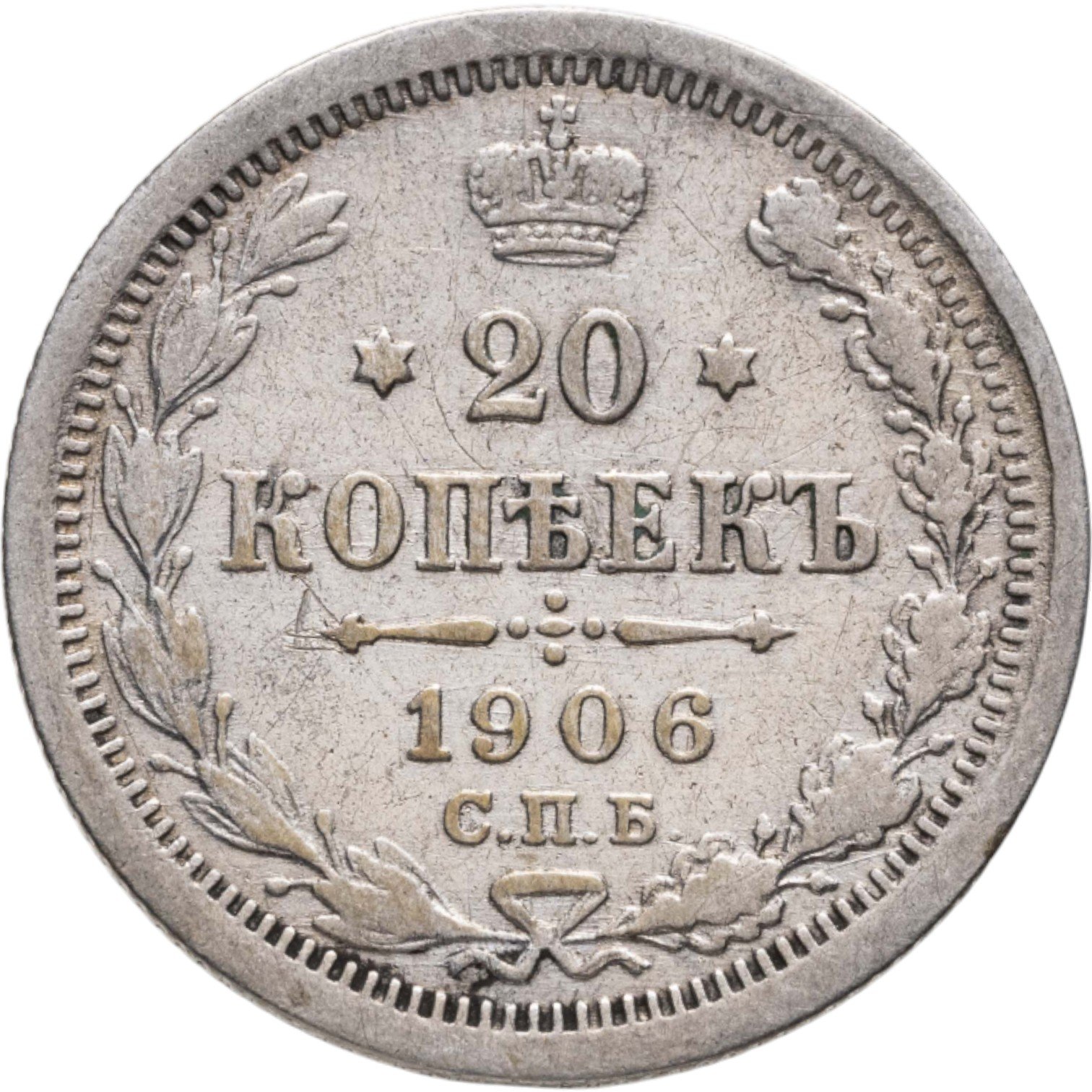 В центре указан номинал - цифра «20», ограниченная с обеих сторон звездочками. Над цифрой – Корона Российской империи. Под цифрой номинала — слово "КОПЕЕК". Ниже, расположен декоративный разделитель в виде двух разнонаправленных фигурных линий и стилизованным из точек крестом между ними. Под разделителем — дата выпуска монеты «1906». Под цифрой даты — обозначение монетного двора «С.П.Б.». Вдоль канта, не доходя до короны, изображен венок из лавровой и дубовой ветвей, которые, в нижней части, перевязаны лентой на узел бантом. По окружности канта имеются рельефные элементы, выполненные в виде зубцов.