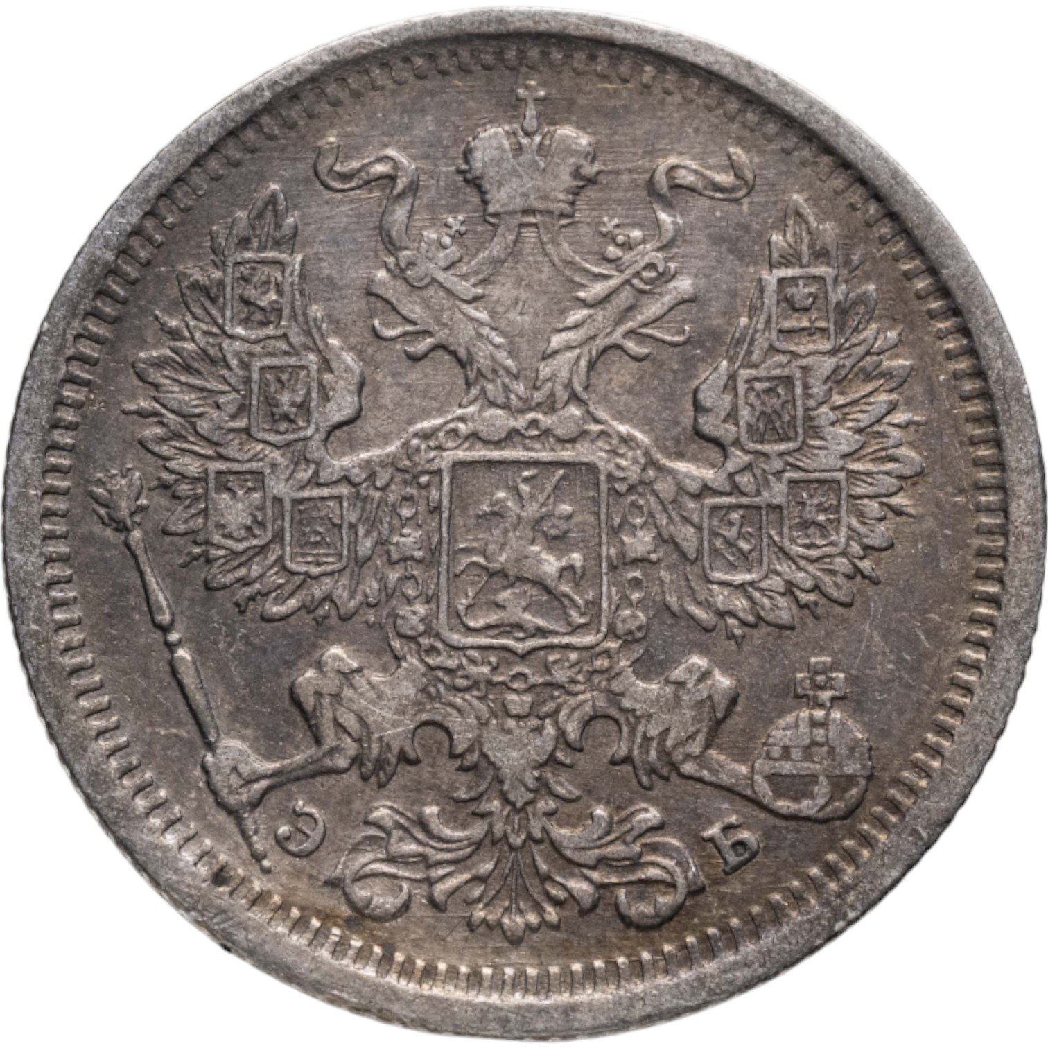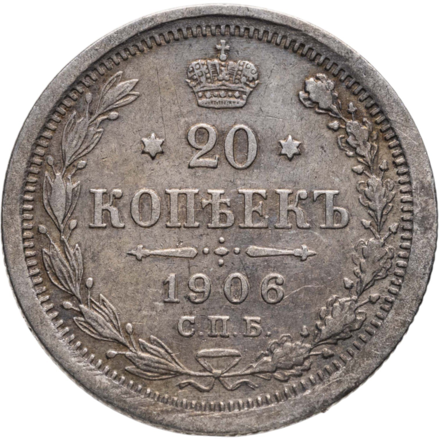 В центре указан номинал - цифра «20», ограниченная с обеих сторон звездочками. Над цифрой – Корона Российской империи. Под цифрой номинала — слово "КОПЕЕК". Ниже, расположен декоративный разделитель в виде двух разнонаправленных фигурных линий и стилизованным из точек крестом между ними. Под разделителем — дата выпуска монеты «1906». Под цифрой даты — обозначение монетного двора «С.П.Б.». Вдоль канта, не доходя до короны, изображен венок из лавровой и дубовой ветвей, которые, в нижней части, перевязаны лентой на узел бантом. По окружности канта имеются рельефные элементы, выполненные в виде зубцов.