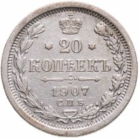В центре указан номинал - цифра «20», ограниченная с обеих сторон звездочками. Над цифрой – Корона Российской империи. Под цифрой номинала — слово "КОПЕЕК". Ниже, расположен декоративный разделитель в виде двух разнонаправленных фигурных линий и стилизованным из точек крестом между ними. Под разделителем — дата выпуска монеты «1907». Под цифрой даты — обозначение монетного двора «С.П.Б.». Вдоль канта, не доходя до короны, изображен венок из лавровой и дубовой ветвей, которые, в нижней части, перевязаны лентой на узел бантом. По окружности канта имеются рельефные элементы, выполненные в виде зубцов.