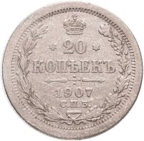 В центре указан номинал - цифра «20», ограниченная с обеих сторон звездочками. Над цифрой – Корона Российской империи. Под цифрой номинала — слово "КОПЕЕК". Ниже, расположен декоративный разделитель в виде двух разнонаправленных фигурных линий и стилизованным из точек крестом между ними. Под разделителем — дата выпуска монеты «1907». Под цифрой даты — обозначение монетного двора «С.П.Б.». Вдоль канта, не доходя до короны, изображен венок из лавровой и дубовой ветвей, которые, в нижней части, перевязаны лентой на узел бантом. По окружности канта имеются рельефные элементы, выполненные в виде зубцов.