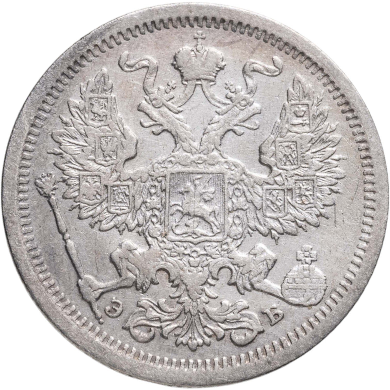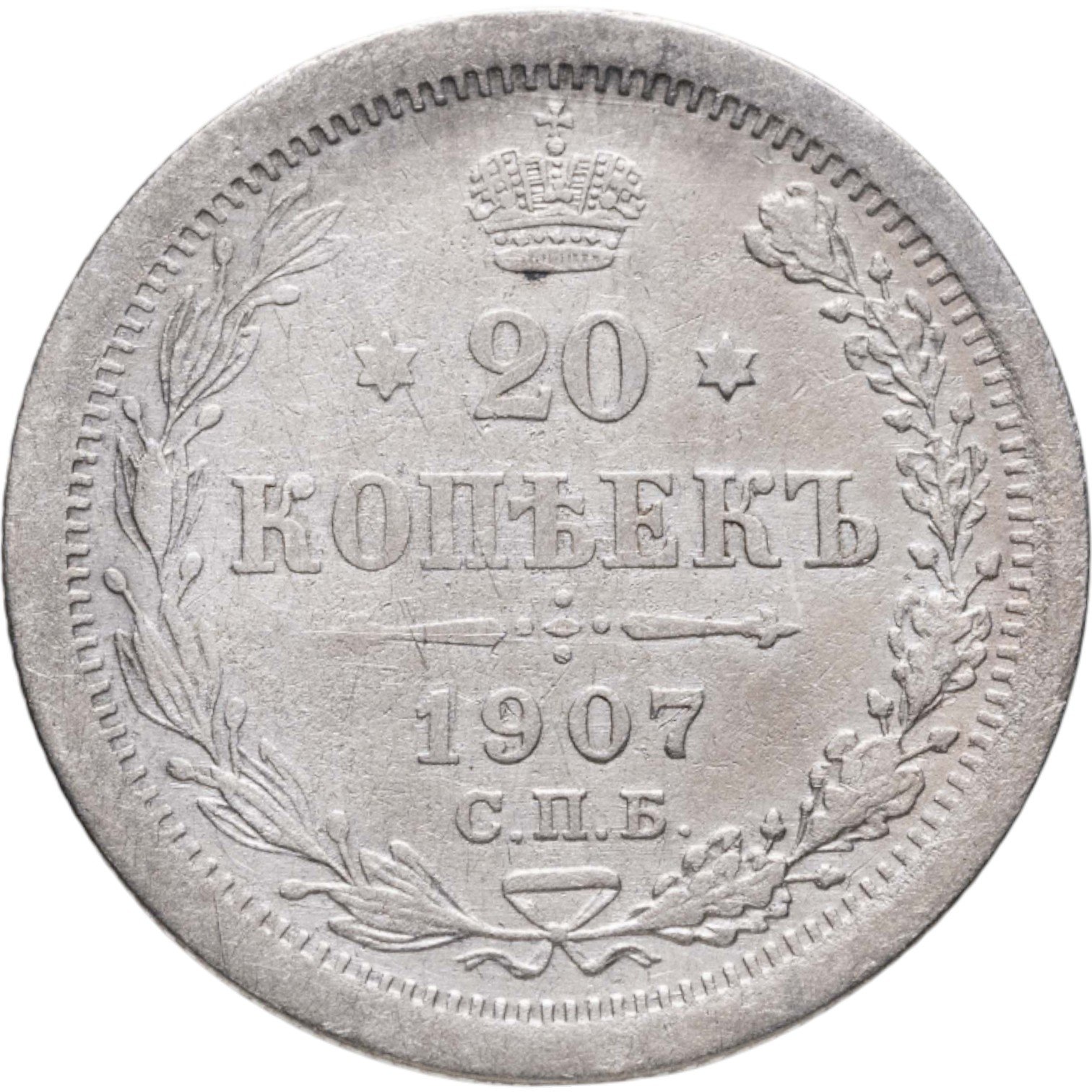 В центре указан номинал - цифра «20», ограниченная с обеих сторон звездочками. Над цифрой – Корона Российской империи. Под цифрой номинала — слово "КОПЕЕК". Ниже, расположен декоративный разделитель в виде двух разнонаправленных фигурных линий и стилизованным из точек крестом между ними. Под разделителем — дата выпуска монеты «1907». Под цифрой даты — обозначение монетного двора «С.П.Б.». Вдоль канта, не доходя до короны, изображен венок из лавровой и дубовой ветвей, которые, в нижней части, перевязаны лентой на узел бантом. По окружности канта имеются рельефные элементы, выполненные в виде зубцов.