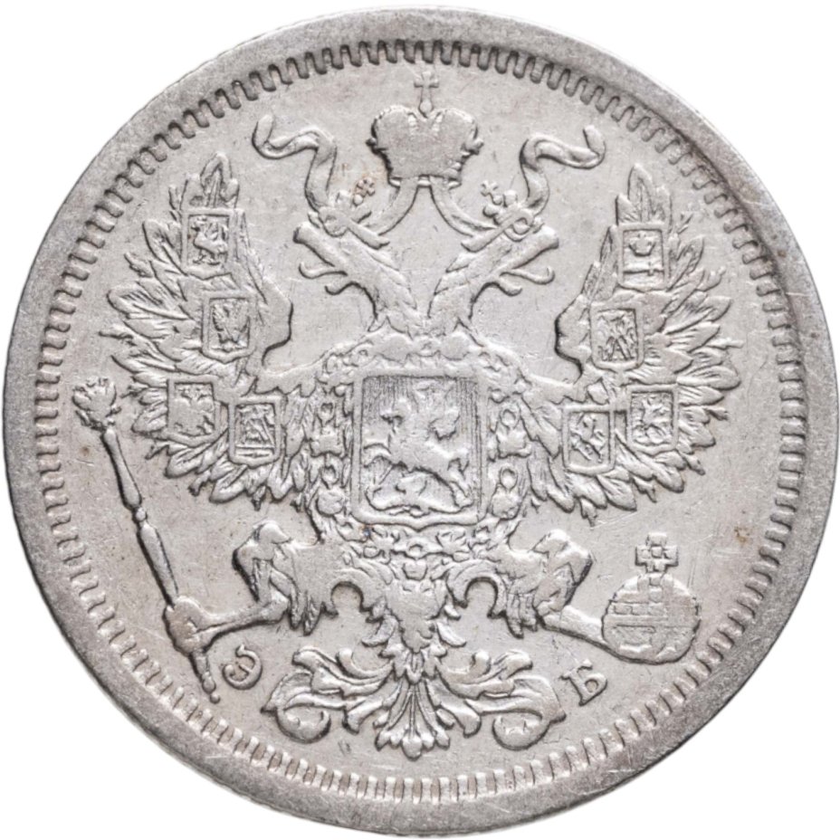 В центре указан номинал - цифра «20», ограниченная с обеих сторон звездочками. Над цифрой – Корона Российской империи. Под цифрой номинала — слово "КОПЕЕК". Ниже, расположен декоративный разделитель в виде двух разнонаправленных фигурных линий и стилизованным из точек крестом между ними. Под разделителем — дата выпуска монеты «1907». Под цифрой даты — обозначение монетного двора «С.П.Б.». Вдоль канта, не доходя до короны, изображен венок из лавровой и дубовой ветвей, которые, в нижней части, перевязаны лентой на узел бантом. По окружности канта имеются рельефные элементы, выполненные в виде зубцов.
