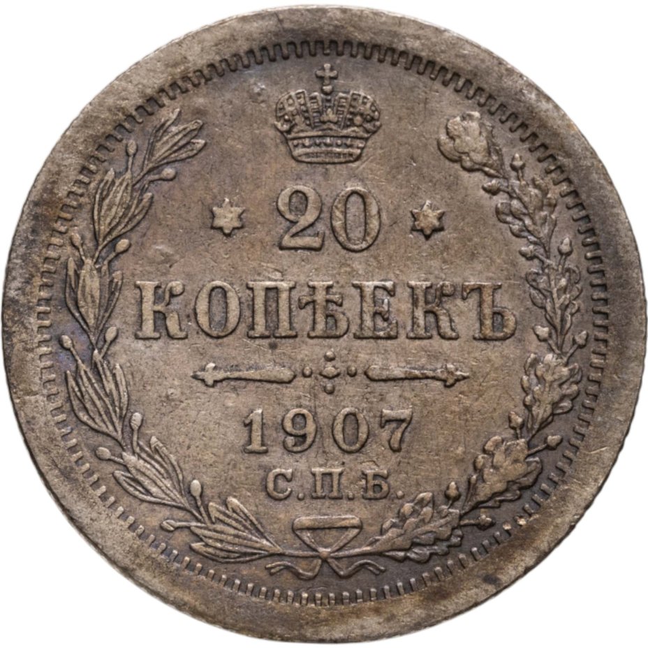 В центре указан номинал - цифра «20», ограниченная с обеих сторон звездочками. Над цифрой – Корона Российской империи. Под цифрой номинала — слово "КОПЕЕК". Ниже, расположен декоративный разделитель в виде двух разнонаправленных фигурных линий и стилизованным из точек крестом между ними. Под разделителем — дата выпуска монеты «1907». Под цифрой даты — обозначение монетного двора «С.П.Б.». Вдоль канта, не доходя до короны, изображен венок из лавровой и дубовой ветвей, которые, в нижней части, перевязаны лентой на узел бантом. По окружности канта имеются рельефные элементы, выполненные в виде зубцов.