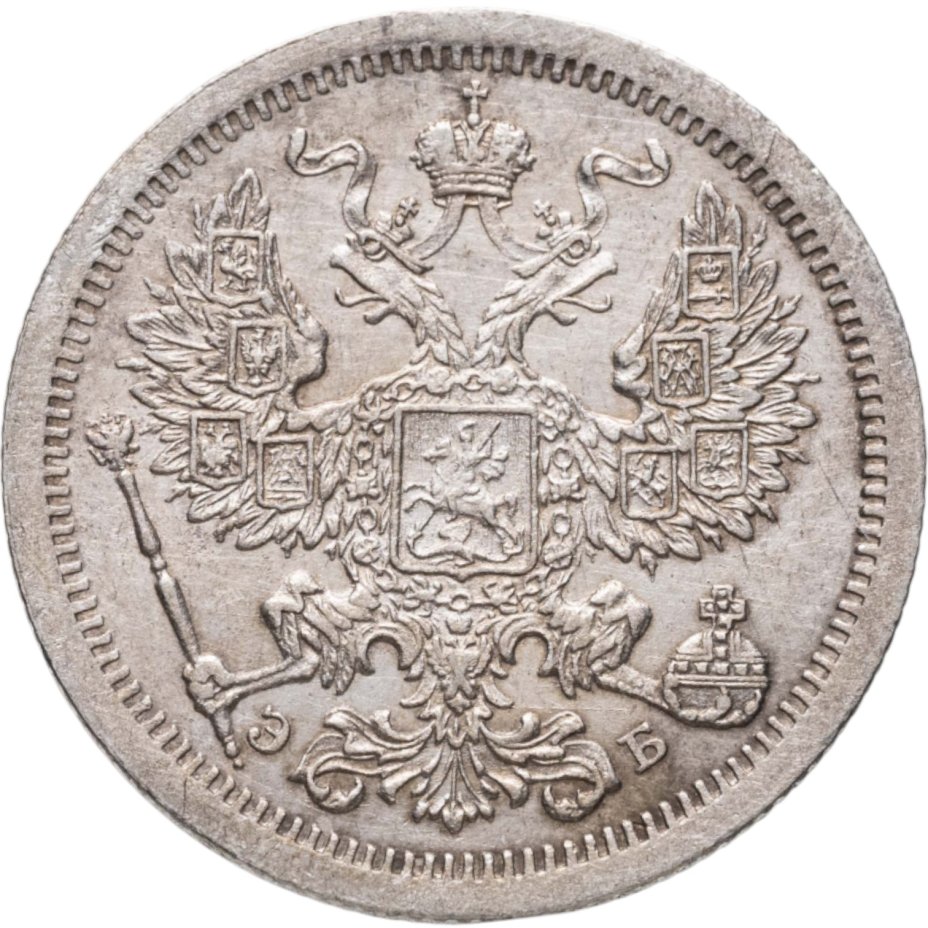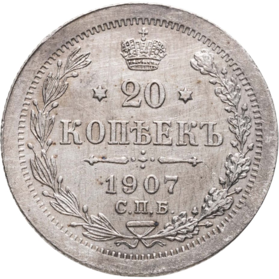 В центре указан номинал - цифра «20», ограниченная с обеих сторон звездочками. Над цифрой – Корона Российской империи. Под цифрой номинала — слово "КОПЕЕК". Ниже, расположен декоративный разделитель в виде двух разнонаправленных фигурных линий и стилизованным из точек крестом между ними. Под разделителем — дата выпуска монеты «1907». Под цифрой даты — обозначение монетного двора «С.П.Б.». Вдоль канта, не доходя до короны, изображен венок из лавровой и дубовой ветвей, которые, в нижней части, перевязаны лентой на узел бантом. По окружности канта имеются рельефные элементы, выполненные в виде зубцов.