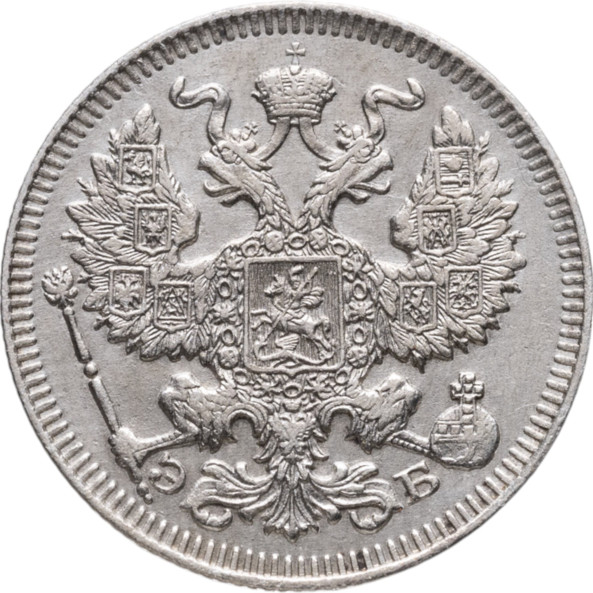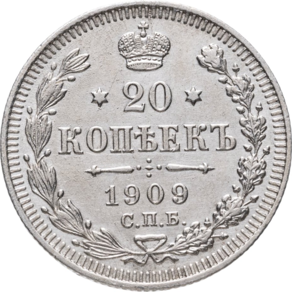В центре указан номинал - цифра «20», ограниченная с обеих сторон звездочками. Над цифрой – Корона Российской империи. Под цифрой номинала — слово "КОПЕЕК". Ниже, расположен декоративный разделитель в виде двух разнонаправленных фигурных линий и стилизованным из точек крестом между ними. Под разделителем — дата выпуска монеты «1909». Под цифрой даты — обозначение монетного двора «С.П.Б.». Вдоль канта, не доходя до короны, изображен венок из лавровой и дубовой ветвей, которые, в нижней части, перевязаны лентой на узел бантом. По окружности канта имеются рельефные элементы, выполненные в виде зубцов.