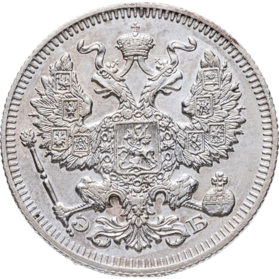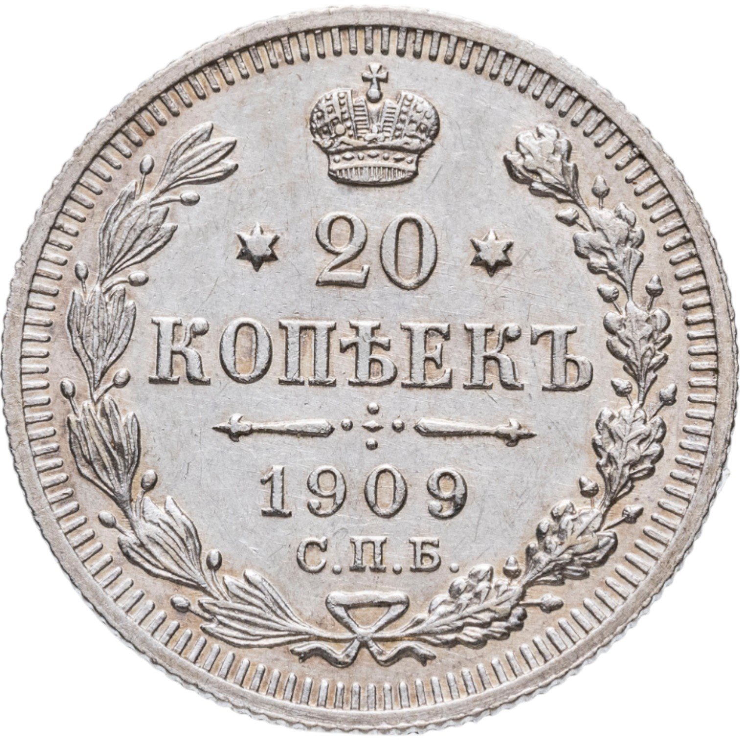 В центре указан номинал - цифра «20», ограниченная с обеих сторон звездочками. Над цифрой – Корона Российской империи. Под цифрой номинала — слово "КОПЕЕК". Ниже, расположен декоративный разделитель в виде двух разнонаправленных фигурных линий и стилизованным из точек крестом между ними. Под разделителем — дата выпуска монеты «1909». Под цифрой даты — обозначение монетного двора «С.П.Б.». Вдоль канта, не доходя до короны, изображен венок из лавровой и дубовой ветвей, которые, в нижней части, перевязаны лентой на узел бантом. По окружности канта имеются рельефные элементы, выполненные в виде зубцов.