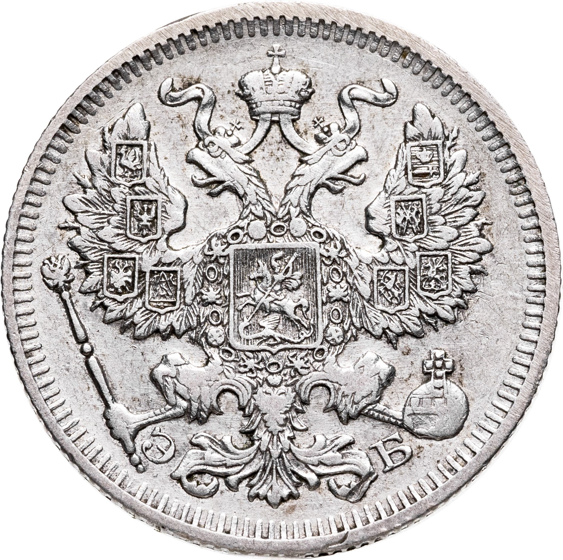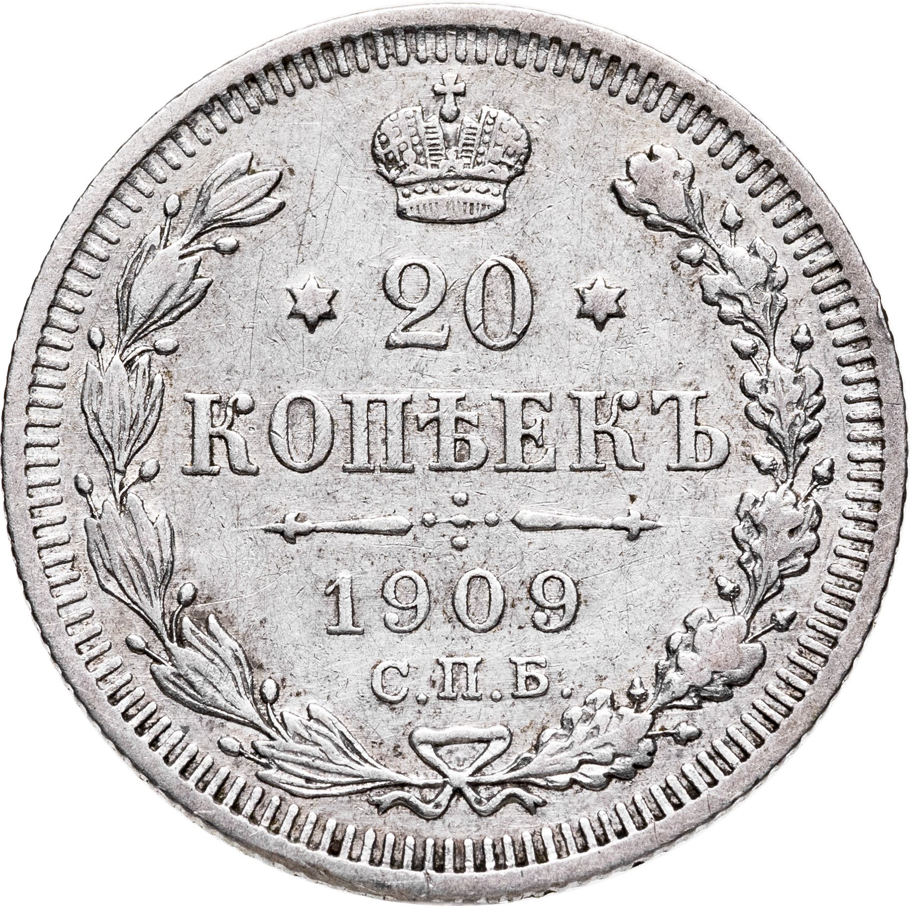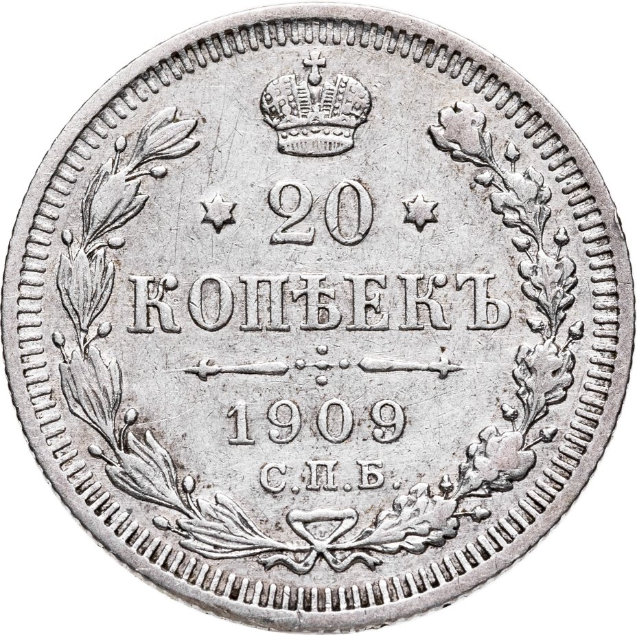 В центре указан номинал - цифра «20», ограниченная с обеих сторон звездочками. Над цифрой – Корона Российской империи. Под цифрой номинала — слово "КОПЕЕК". Ниже, расположен декоративный разделитель в виде двух разнонаправленных фигурных линий и стилизованным из точек крестом между ними. Под разделителем — дата выпуска монеты «1909». Под цифрой даты — обозначение монетного двора «С.П.Б.». Вдоль канта, не доходя до короны, изображен венок из лавровой и дубовой ветвей, которые, в нижней части, перевязаны лентой на узел бантом. По окружности канта имеются рельефные элементы, выполненные в виде зубцов.
