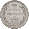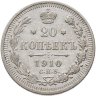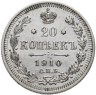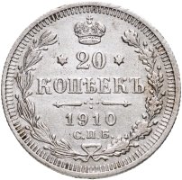 В центре указан номинал - цифра «20», ограниченная с обеих сторон звездочками. Над цифрой – Корона Российской империи. Под цифрой номинала — слово "КОПЕЕК". Ниже, расположен декоративный разделитель в виде двух разнонаправленных фигурных линий и стилизованным из точек крестом между ними. Под разделителем — дата выпуска монеты «1910». Под цифрой даты — обозначение монетного двора «С.П.Б.». Вдоль канта, не доходя до короны, изображен венок из лавровой и дубовой ветвей, которые, в нижней части, перевязаны лентой на узел бантом. По окружности канта имеются рельефные элементы, выполненные в виде зубцов.