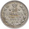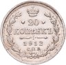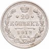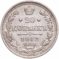 В центре указан номинал - цифра «20», ограниченная с обеих сторон звездочками. Над цифрой – Корона Российской империи. Под цифрой номинала — слово "КОПЕЕК". Ниже, расположен декоративный разделитель в виде двух разнонаправленных фигурных линий и стилизованным из точек крестом между ними. Под разделителем — дата выпуска монеты «1912». Под цифрой даты — обозначение монетного двора «С.П.Б.». Вдоль канта, не доходя до короны, изображен венок из лавровой и дубовой ветвей, которые, в нижней части, перевязаны лентой на узел бантом. По окружности канта имеются рельефные элементы, выполненные в виде зубцов.
