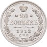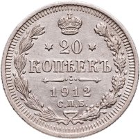 В центре указан номинал - цифра «20», ограниченная с обеих сторон звездочками. Над цифрой – Корона Российской империи. Под цифрой номинала — слово "КОПЕЕК". Ниже, расположен декоративный разделитель в виде двух разнонаправленных фигурных линий и стилизованным из точек крестом между ними. Под разделителем — дата выпуска монеты «1912». Под цифрой даты — обозначение монетного двора «С.П.Б.». Вдоль канта, не доходя до короны, изображен венок из лавровой и дубовой ветвей, которые, в нижней части, перевязаны лентой на узел бантом. По окружности канта имеются рельефные элементы, выполненные в виде зубцов.