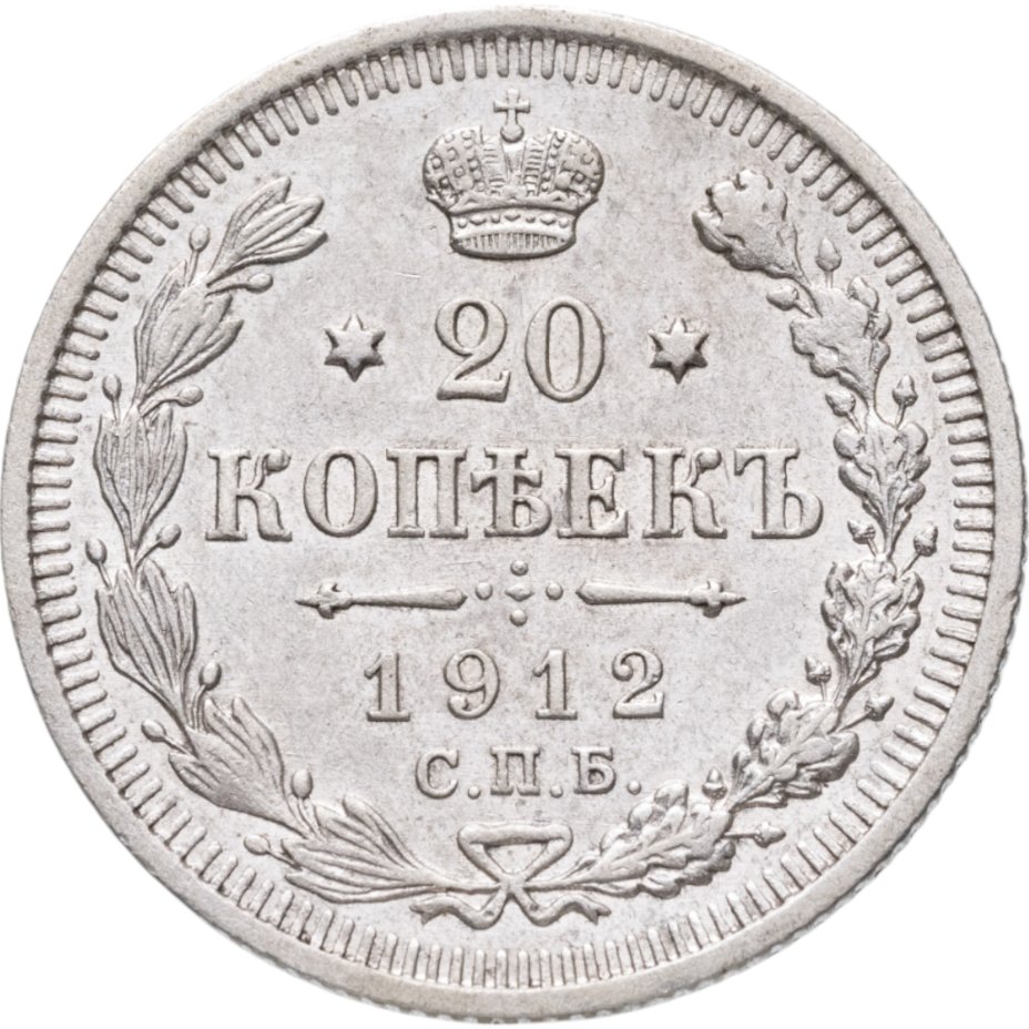 В центре указан номинал - цифра «20», ограниченная с обеих сторон звездочками. Над цифрой – Корона Российской империи. Под цифрой номинала — слово "КОПЕЕК". Ниже, расположен декоративный разделитель в виде двух разнонаправленных фигурных линий и стилизованным из точек крестом между ними. Под разделителем — дата выпуска монеты «1912». Под цифрой даты — обозначение монетного двора «С.П.Б.». Вдоль канта, не доходя до короны, изображен венок из лавровой и дубовой ветвей, которые, в нижней части, перевязаны лентой на узел бантом. По окружности канта имеются рельефные элементы, выполненные в виде зубцов.