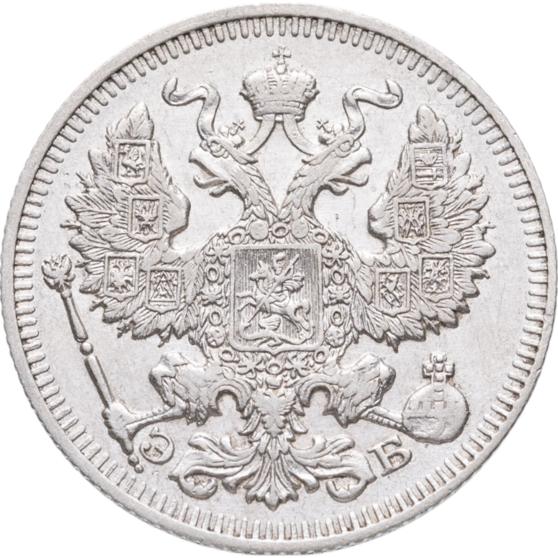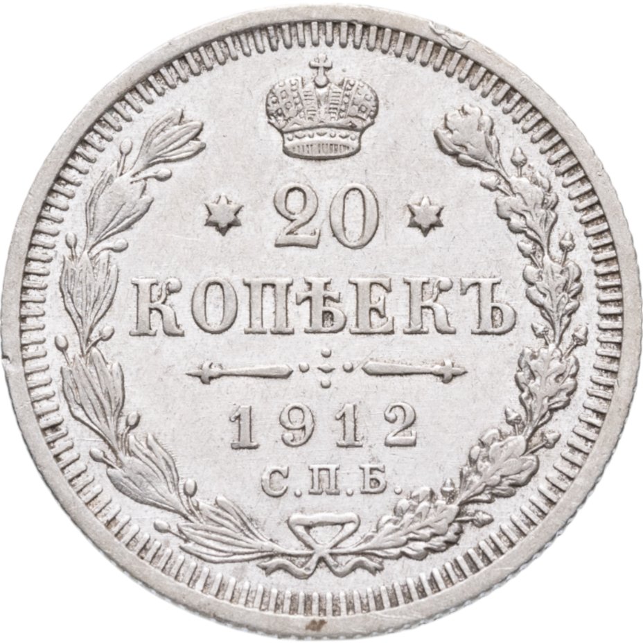 В центре указан номинал - цифра «20», ограниченная с обеих сторон звездочками. Над цифрой – Корона Российской империи. Под цифрой номинала — слово "КОПЕЕК". Ниже, расположен декоративный разделитель в виде двух разнонаправленных фигурных линий и стилизованным из точек крестом между ними. Под разделителем — дата выпуска монеты «1912». Под цифрой даты — обозначение монетного двора «С.П.Б.». Вдоль канта, не доходя до короны, изображен венок из лавровой и дубовой ветвей, которые, в нижней части, перевязаны лентой на узел бантом. По окружности канта имеются рельефные элементы, выполненные в виде зубцов.
