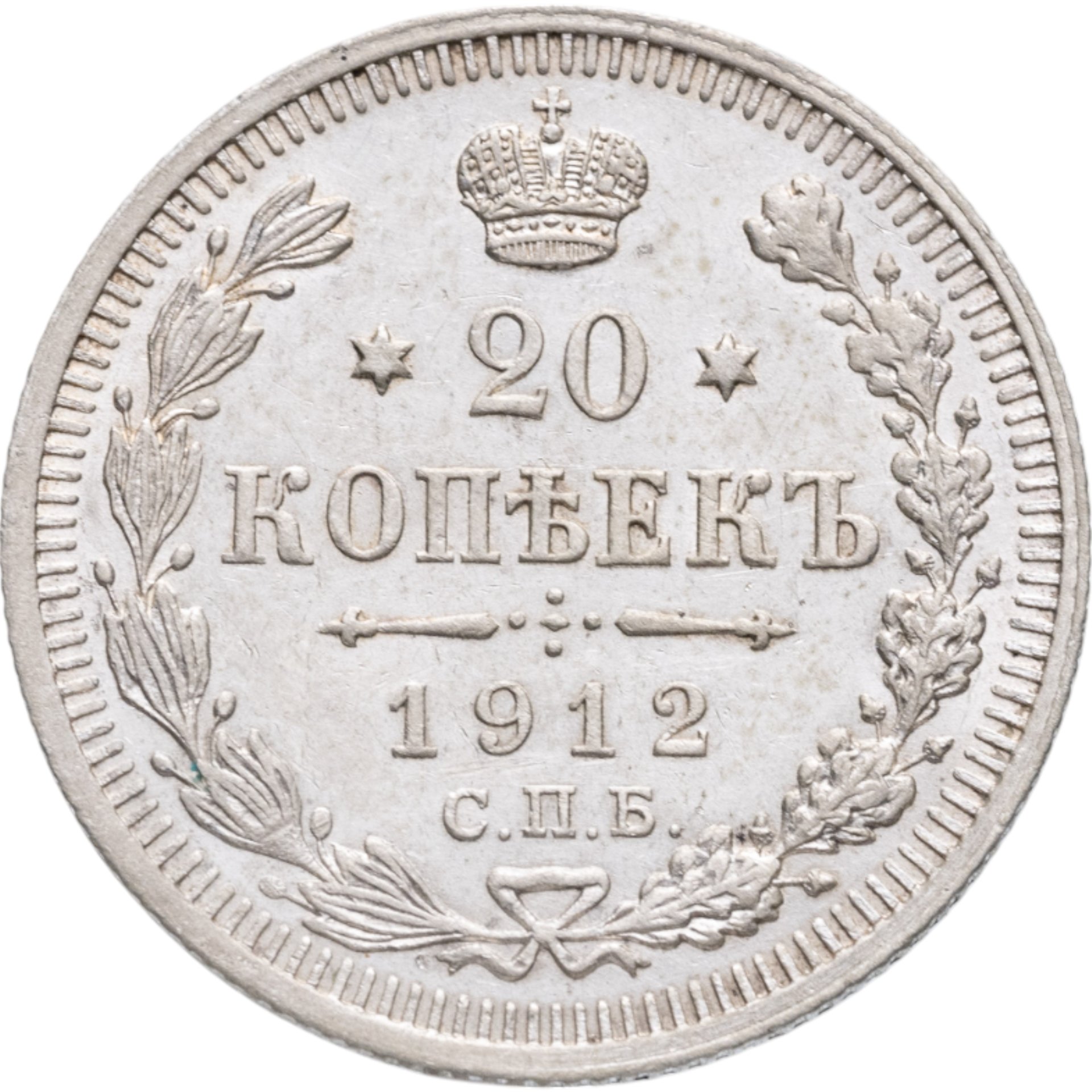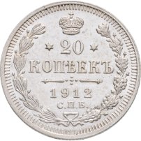 В центре указан номинал - цифра «20», ограниченная с обеих сторон звездочками. Над цифрой – Корона Российской империи. Под цифрой номинала — слово "КОПЕЕК". Ниже, расположен декоративный разделитель в виде двух разнонаправленных фигурных линий и стилизованным из точек крестом между ними. Под разделителем — дата выпуска монеты «1912». Под цифрой даты — обозначение монетного двора «С.П.Б.». Вдоль канта, не доходя до короны, изображен венок из лавровой и дубовой ветвей, которые, в нижней части, перевязаны лентой на узел бантом. По окружности канта имеются рельефные элементы, выполненные в виде зубцов.