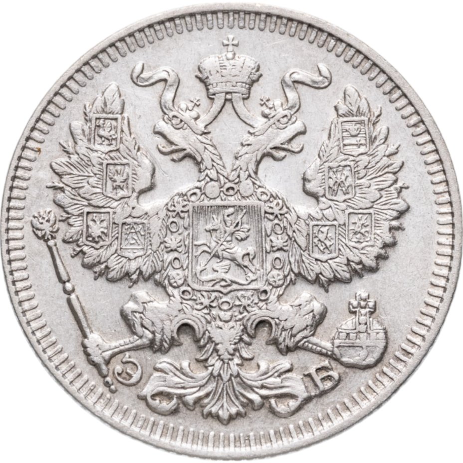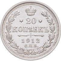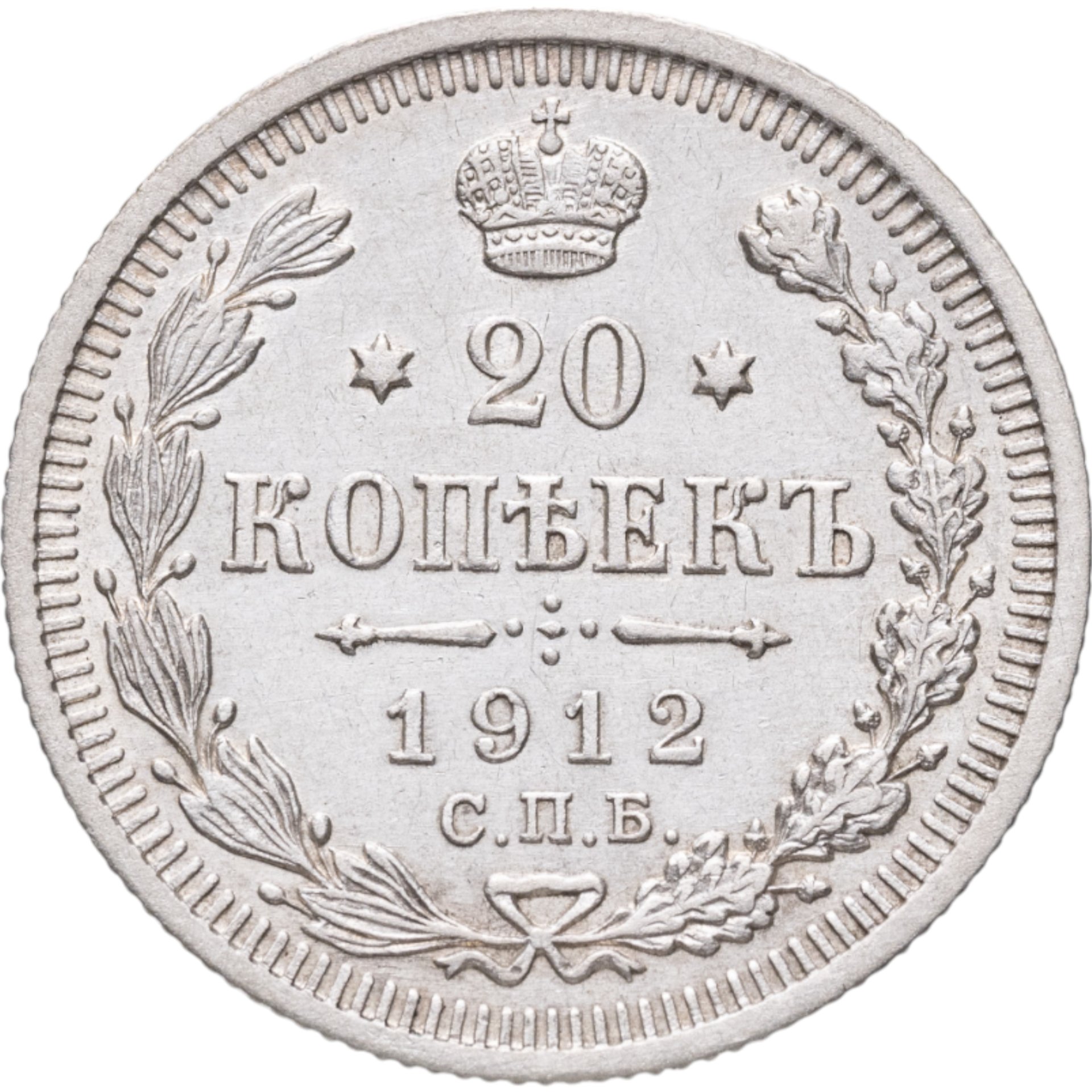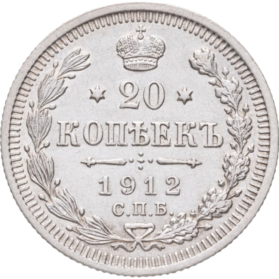 В центре указан номинал - цифра «20», ограниченная с обеих сторон звездочками. Над цифрой – Корона Российской империи. Под цифрой номинала — слово "КОПЕЕК". Ниже, расположен декоративный разделитель в виде двух разнонаправленных фигурных линий и стилизованным из точек крестом между ними. Под разделителем — дата выпуска монеты «1912». Под цифрой даты — обозначение монетного двора «С.П.Б.». Вдоль канта, не доходя до короны, изображен венок из лавровой и дубовой ветвей, которые, в нижней части, перевязаны лентой на узел бантом. По окружности канта имеются рельефные элементы, выполненные в виде зубцов.