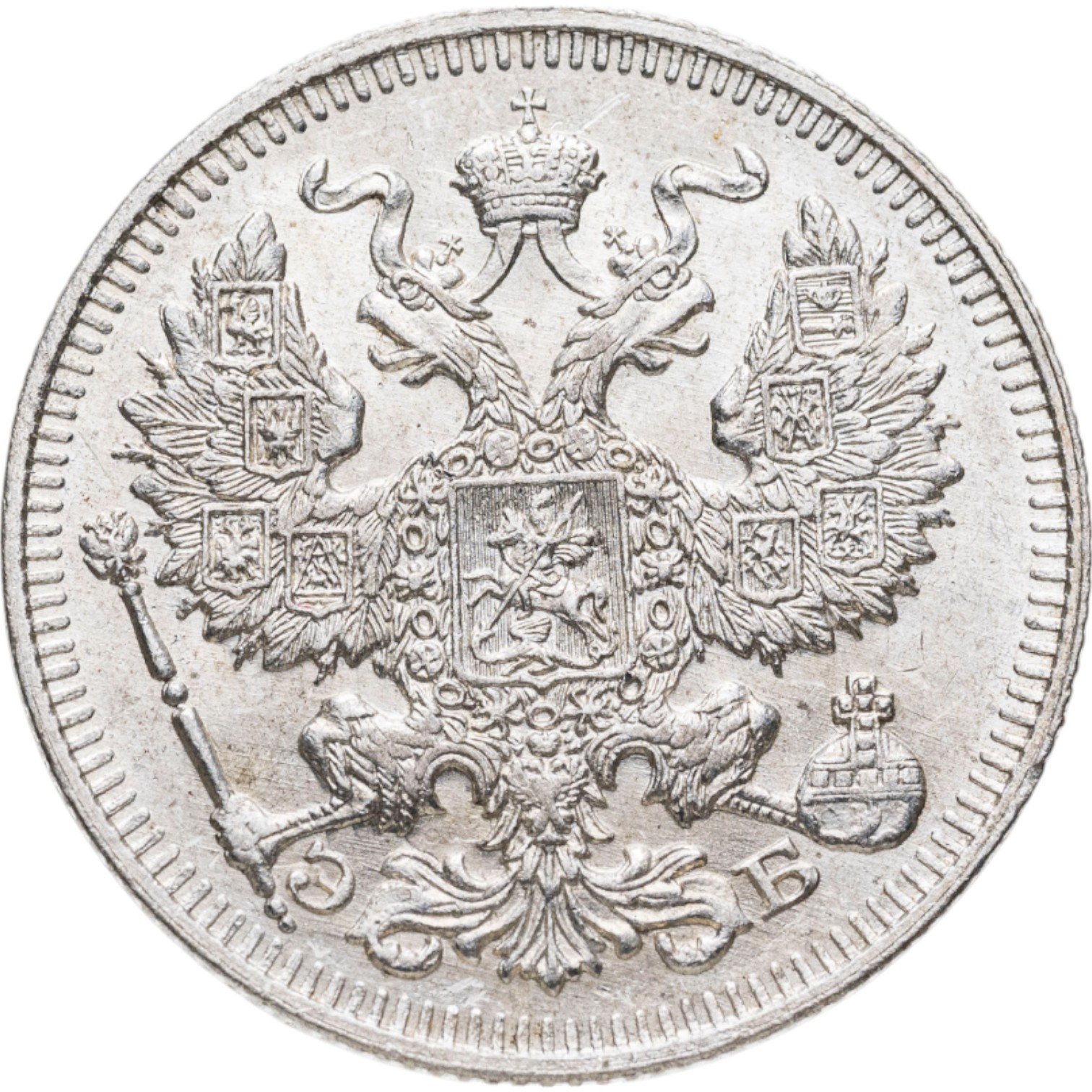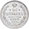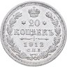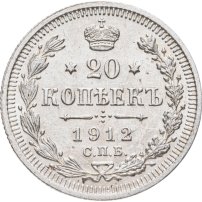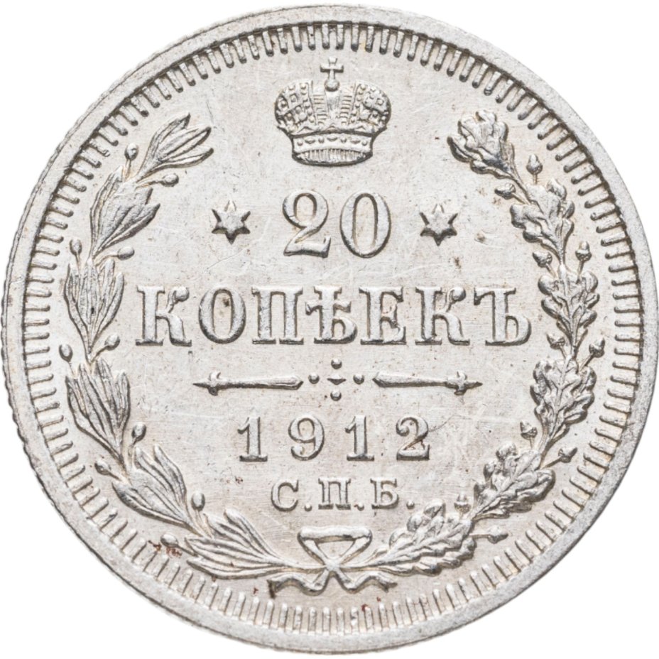 В центре указан номинал - цифра «20», ограниченная с обеих сторон звездочками. Над цифрой – Корона Российской империи. Под цифрой номинала — слово "КОПЕЕК". Ниже, расположен декоративный разделитель в виде двух разнонаправленных фигурных линий и стилизованным из точек крестом между ними. Под разделителем — дата выпуска монеты «1912». Под цифрой даты — обозначение монетного двора «С.П.Б.». Вдоль канта, не доходя до короны, изображен венок из лавровой и дубовой ветвей, которые, в нижней части, перевязаны лентой на узел бантом. По окружности канта имеются рельефные элементы, выполненные в виде зубцов.