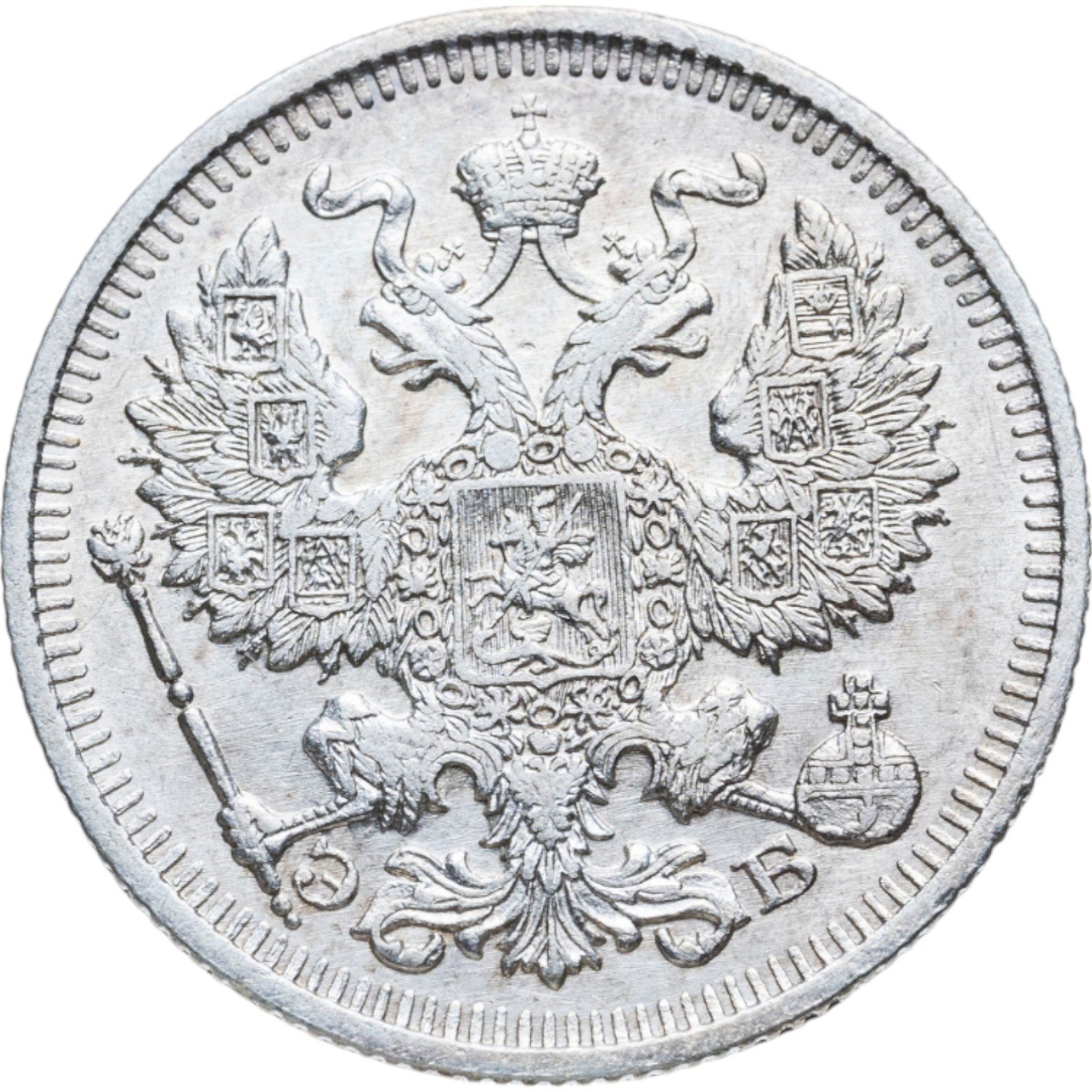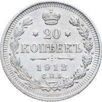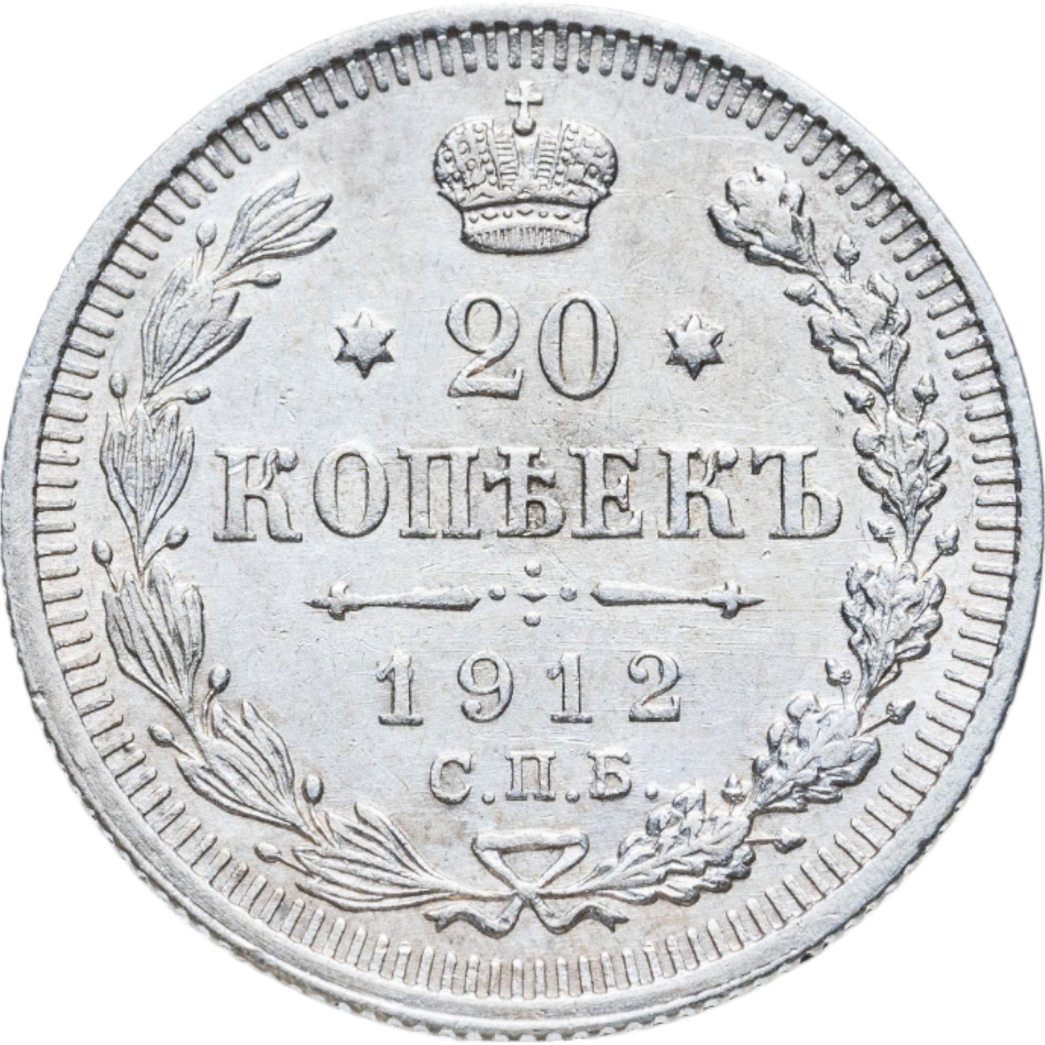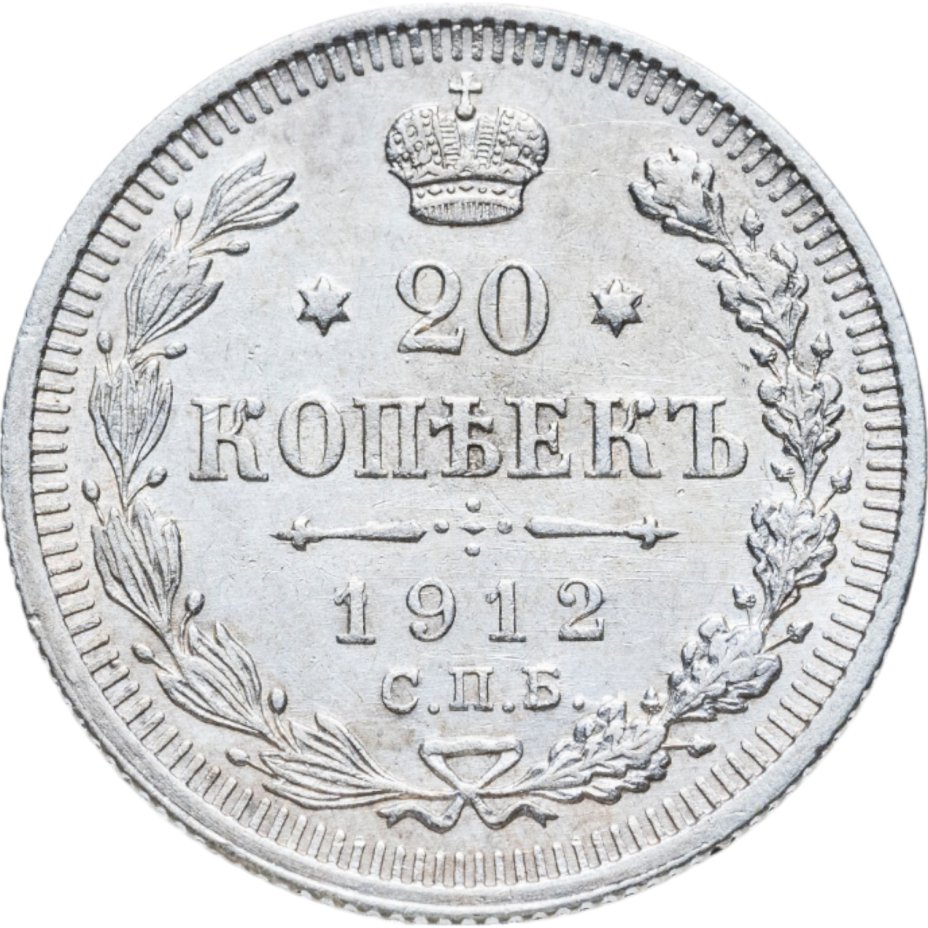 В центре указан номинал - цифра «20», ограниченная с обеих сторон звездочками. Над цифрой – Корона Российской империи. Под цифрой номинала — слово "КОПЕЕК". Ниже, расположен декоративный разделитель в виде двух разнонаправленных фигурных линий и стилизованным из точек крестом между ними. Под разделителем — дата выпуска монеты «1912». Под цифрой даты — обозначение монетного двора «С.П.Б.». Вдоль канта, не доходя до короны, изображен венок из лавровой и дубовой ветвей, которые, в нижней части, перевязаны лентой на узел бантом. По окружности канта имеются рельефные элементы, выполненные в виде зубцов.