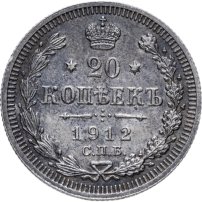 В центре указан номинал - цифра «20», ограниченная с обеих сторон звездочками. Над цифрой – Корона Российской империи. Под цифрой номинала — слово "КОПЕЕК". Ниже, расположен декоративный разделитель в виде двух разнонаправленных фигурных линий и стилизованным из точек крестом между ними. Под разделителем — дата выпуска монеты «1912». Под цифрой даты — обозначение монетного двора «С.П.Б.». Вдоль канта, не доходя до короны, изображен венок из лавровой и дубовой ветвей, которые, в нижней части, перевязаны лентой на узел бантом. По окружности канта имеются рельефные элементы, выполненные в виде зубцов.